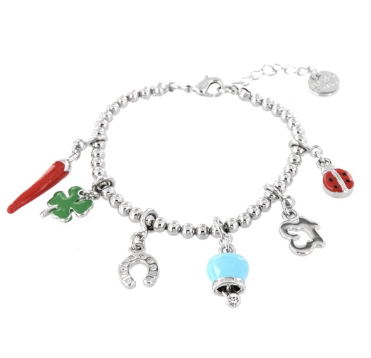 Bracciale in metallo con corno napoletano, quadrifoglio, coccinella, campana capri.Consegna entro 3gg lavorativi.