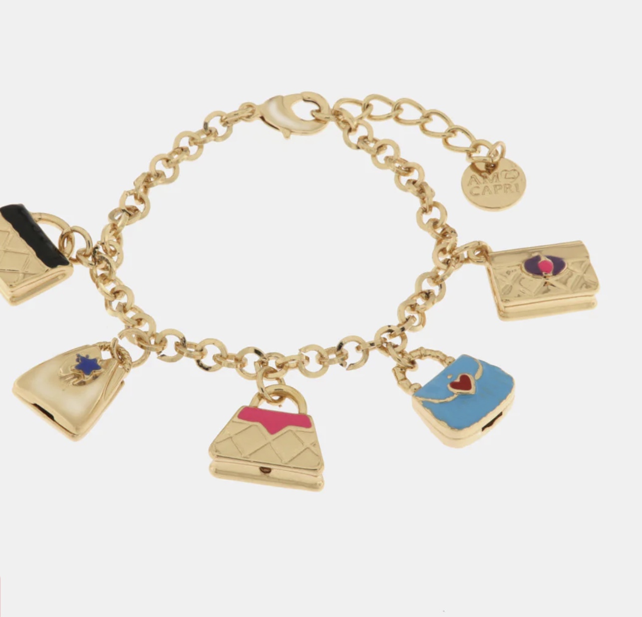 Bracciale in Metallo con borsette colorate. Misura 17 cm con 3 cm di estensione. Consegna entro 3gg lavorativi.