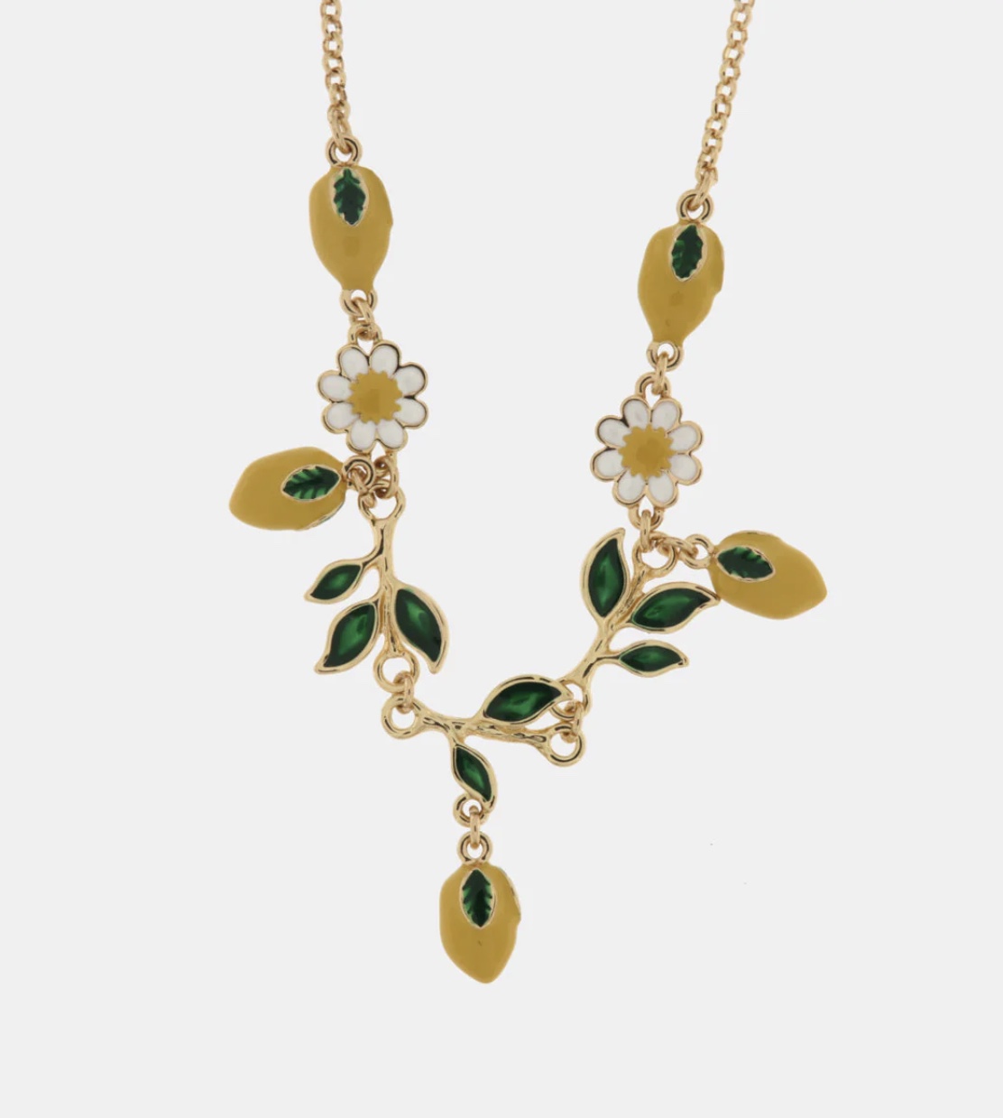 Collana in Metallo con limoni e foglie . Misura 45 cm con estensione di 5 cm. Consegna entro 3gg lavorativi.