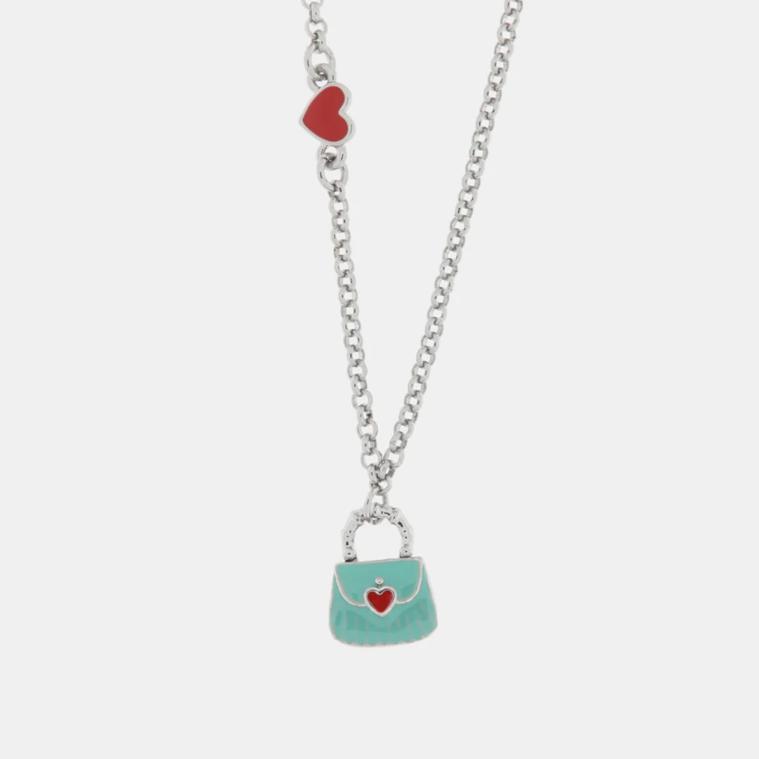 Collana in Metallo con borsa azzurra e cuori rossi . Misura 40 cm + 5 cm di estensione. Consegna entro 3gg lavorativi.