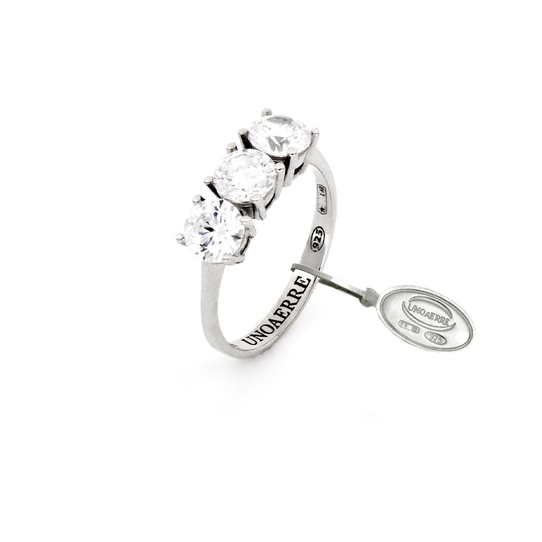 Anello trilogy in argento rodiato 925 con pietre zirconia cubica bianca di diametro 5 mm e sigillo di garanzia. Consegna entro 3gg lavorativi.