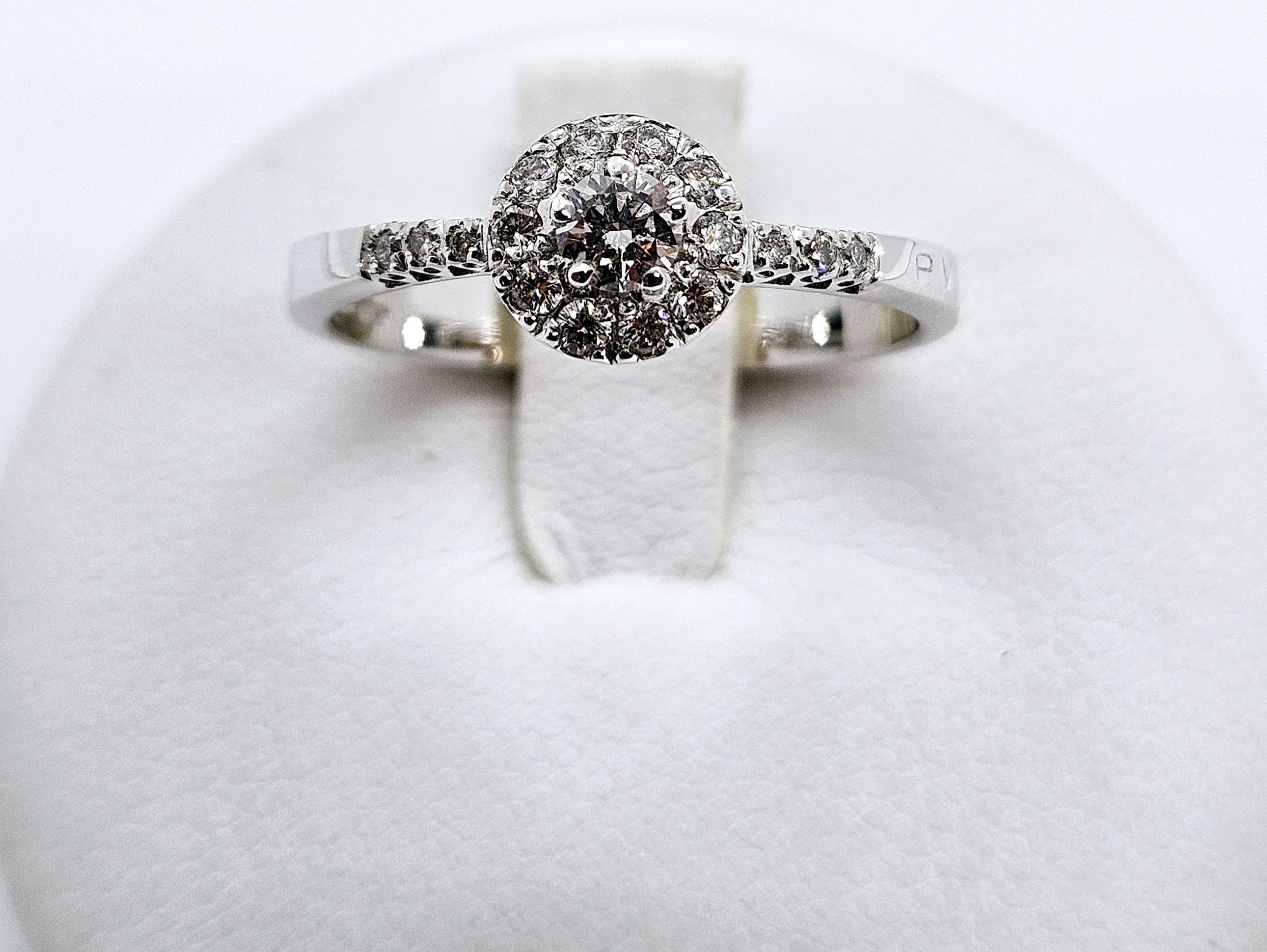 Anello in oro bianco 18kt con Diamante centrale del peso di kt0,13 e Diamanti contorno e laterali del peso di kt0,15 Qualità colore G purezza VVS Misura disponibile 14/15 Consegna entro 3gg
