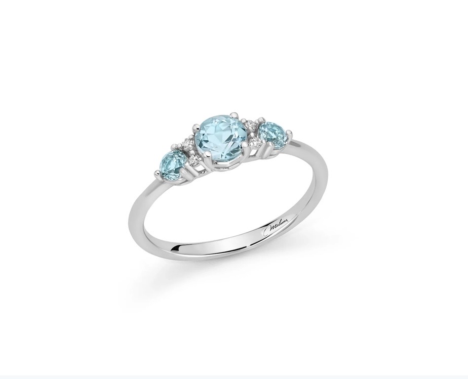 azzurri naturali taglio rotondo 3 mm 0,28 ct totali, 1 topazio azzurro naturale taglio rotondo 5 mm 0,6 ct, più 4 diamanti naturali 2,24 pt totali.