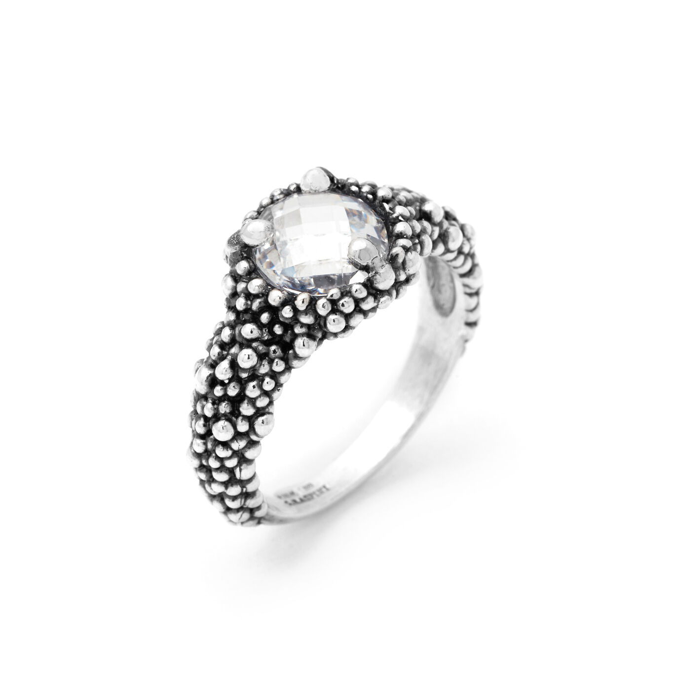 Anello in argento dalla luminosità purissima di uno zircone trasparente che incontra la bellezza contemporanea del decoro stile Perlage nasce questo anello elegante e versatile. Misura 16. Realizzato completamente a mano in azienda con la tecnica della fusione a cera persa. Consegna entro 3gg lavorativi. Spedizione gratuita.