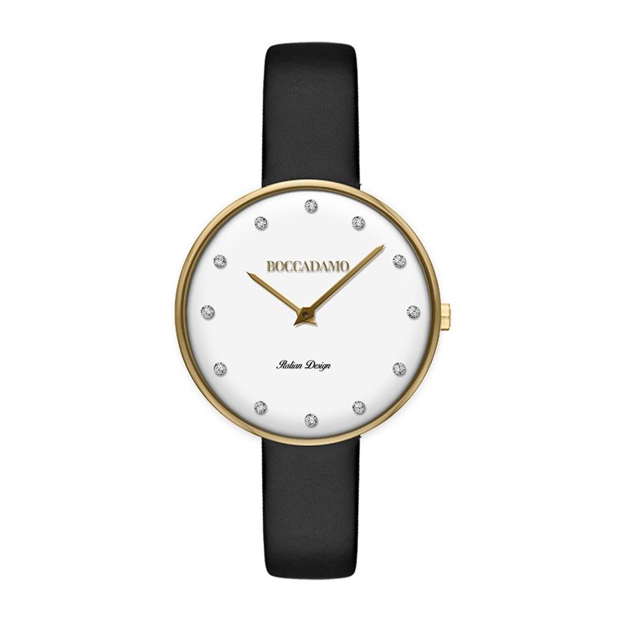 Orologio da polso da donna con quadrante circolare bianco, indici in cristallo Swarovski crystal, lancette e cassa placcati oro giallo, cinturino in vera pelle nera.