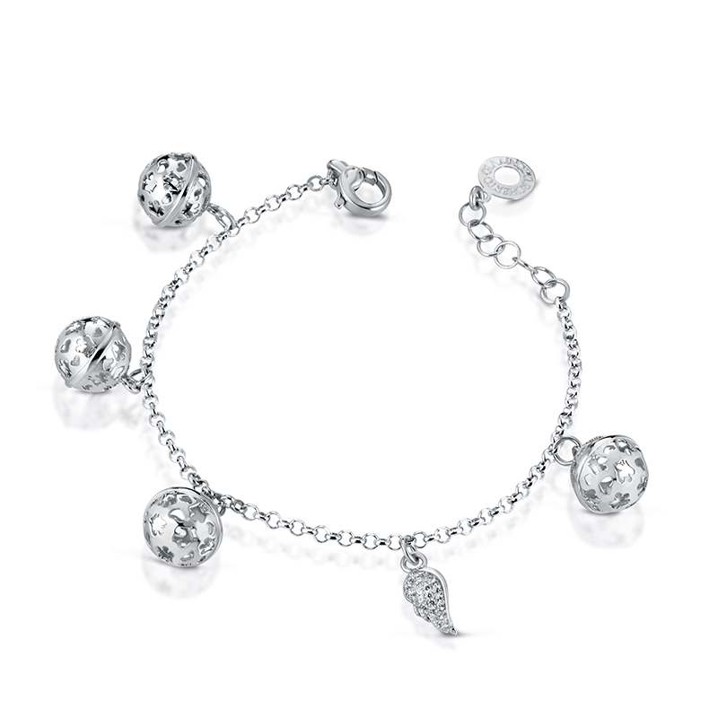 Bracciale in argento 925 mill. Con n.4 sfere Chiama Angeli del diametro di cm 1,1 più Ala pendente con zirconi bianchi. Lunghezza massima cm.19. Consegna entro 3gg. Spedizione gratuita.