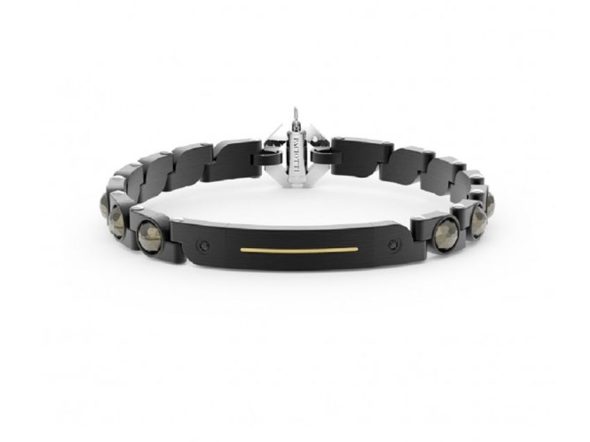 Targa centrale con 2 diamanti neri da 3,6 punti di carato totali e dettaglio in oro 18kt.Pietre naturali presenti su tutto il bracciale,qualità Pirite nota come pietra capace d’offrire protezione ed avere effetti benefici sulla persona che l’indossa.Disponibile mis.21 cm Consegna entro 3gg. Spedizione gratuita