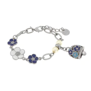 Bracciale in Metallo con campanella e fiori blu e bianchi. Misura 17 cm. Consegna entro 3gg lavorativi.