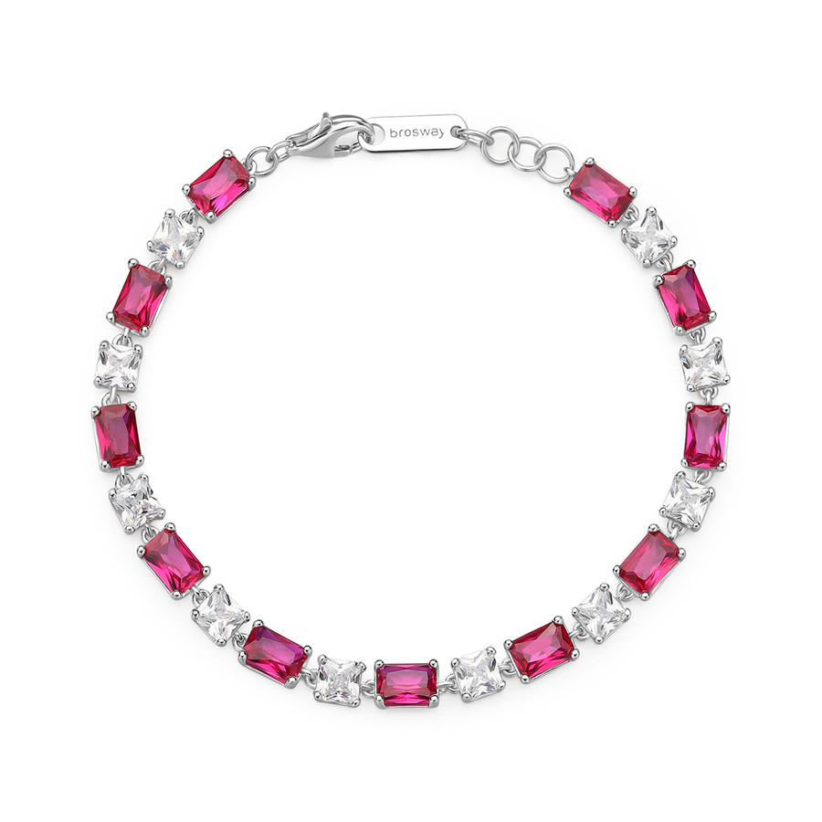Bracciale in argento rodiato 925‰ con cushion cubic zirconia chiari e baguette cubic zirconia colore ruby.