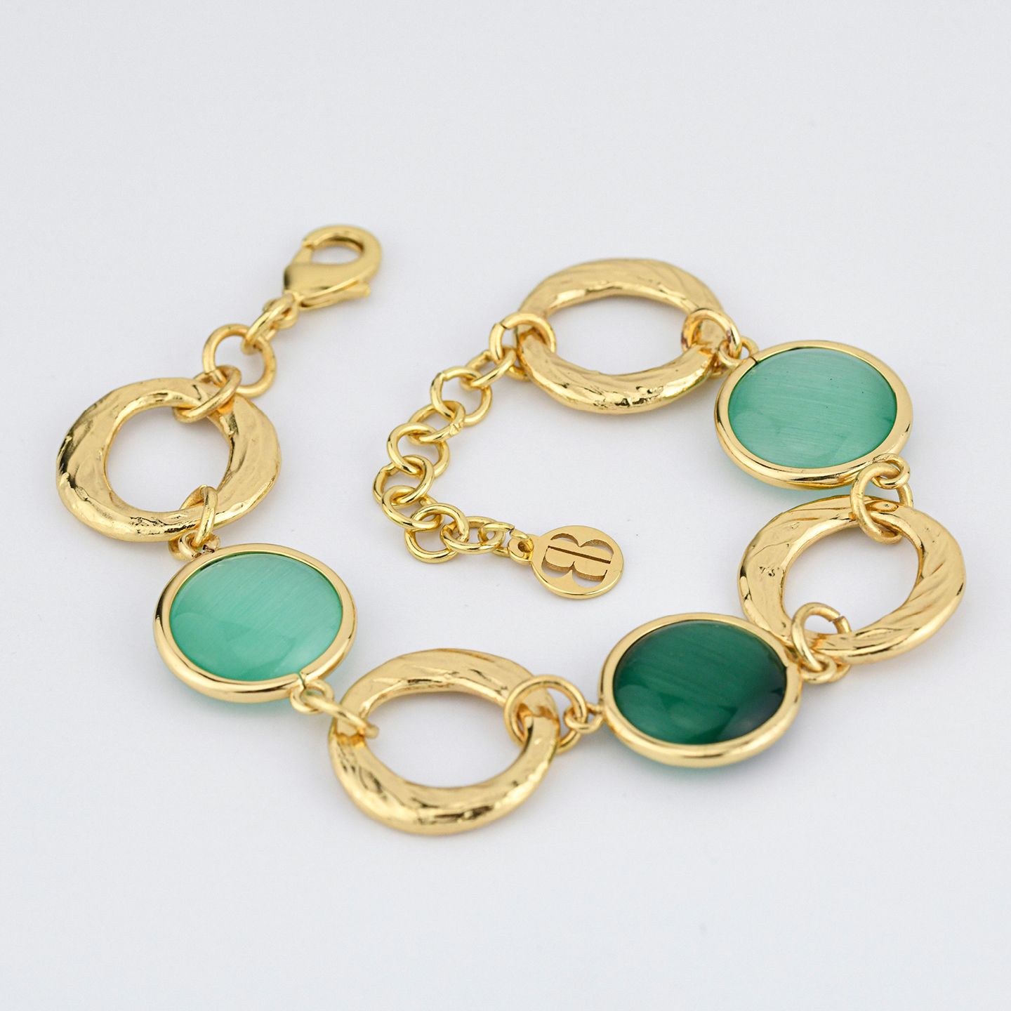 Bracciale placcato oro giallo con cristalli effetto cabochon di colore verde scuro e verde acqua tra moduli circolari martellati. Misura 16 cm estendibile a 20 cm. Consegna entro 3gg lavorativi. Spedizione gratuita.