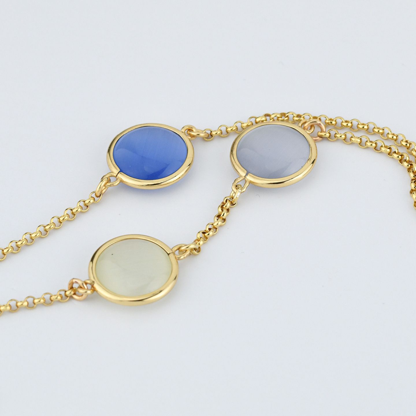 Bracciale placcato oro giallo con cristalli effetto cabochon di colore madreperla, viola scuro e grigio, incrociati da una doppia catena. Misura 16 cm estendibile a 20 cm. Consegna entro 3gg lavorativi.