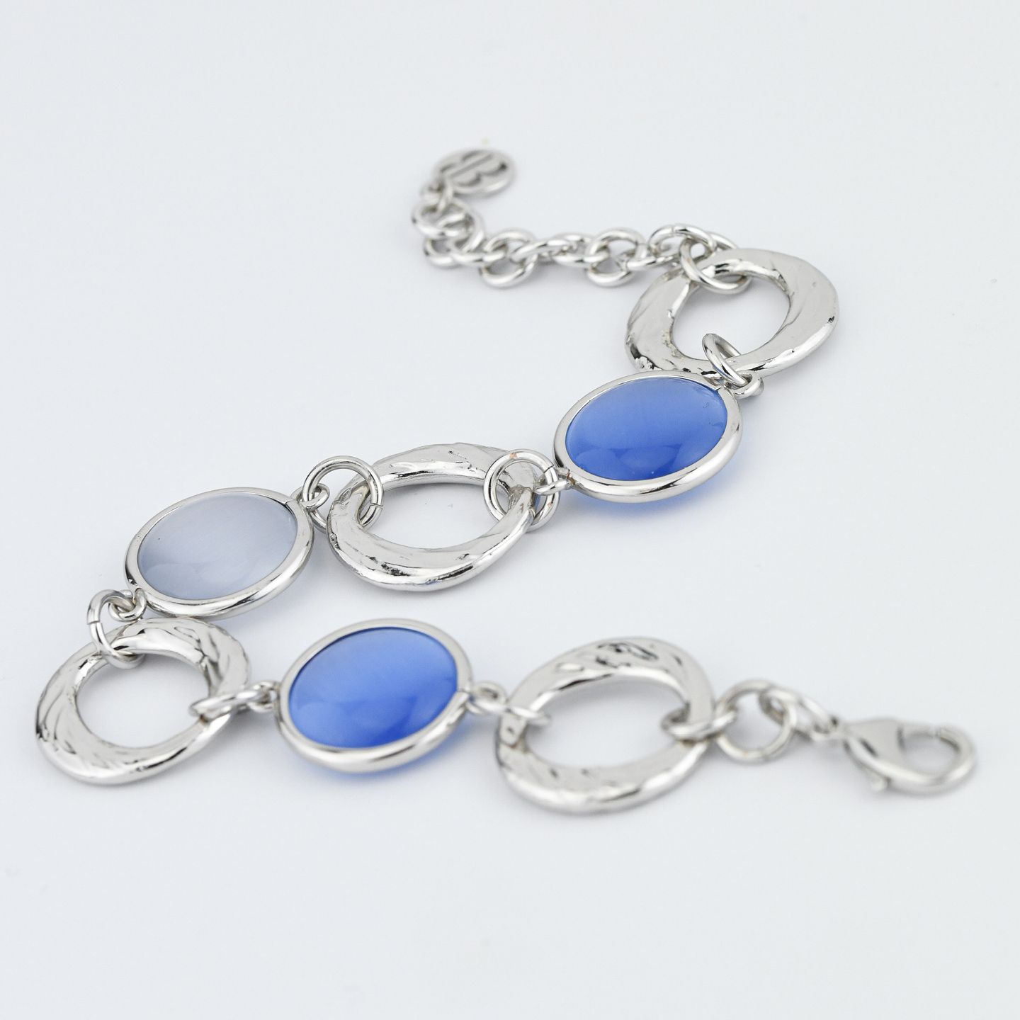 Bracciale rodiato con cristalli effetto cabochon di colore blu marino e grigio tra moduli circolari martellati. Misura 16 cm con estensione a 20 cm. Consegna entro 3gg lavorativi. Spedizione gratuita.