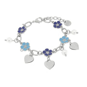 Bracciale in Metallo con fiori blu e cuori pendenti. Misura 17 cm + 3 di estensione. Consegna entro 3gg lavorativi.