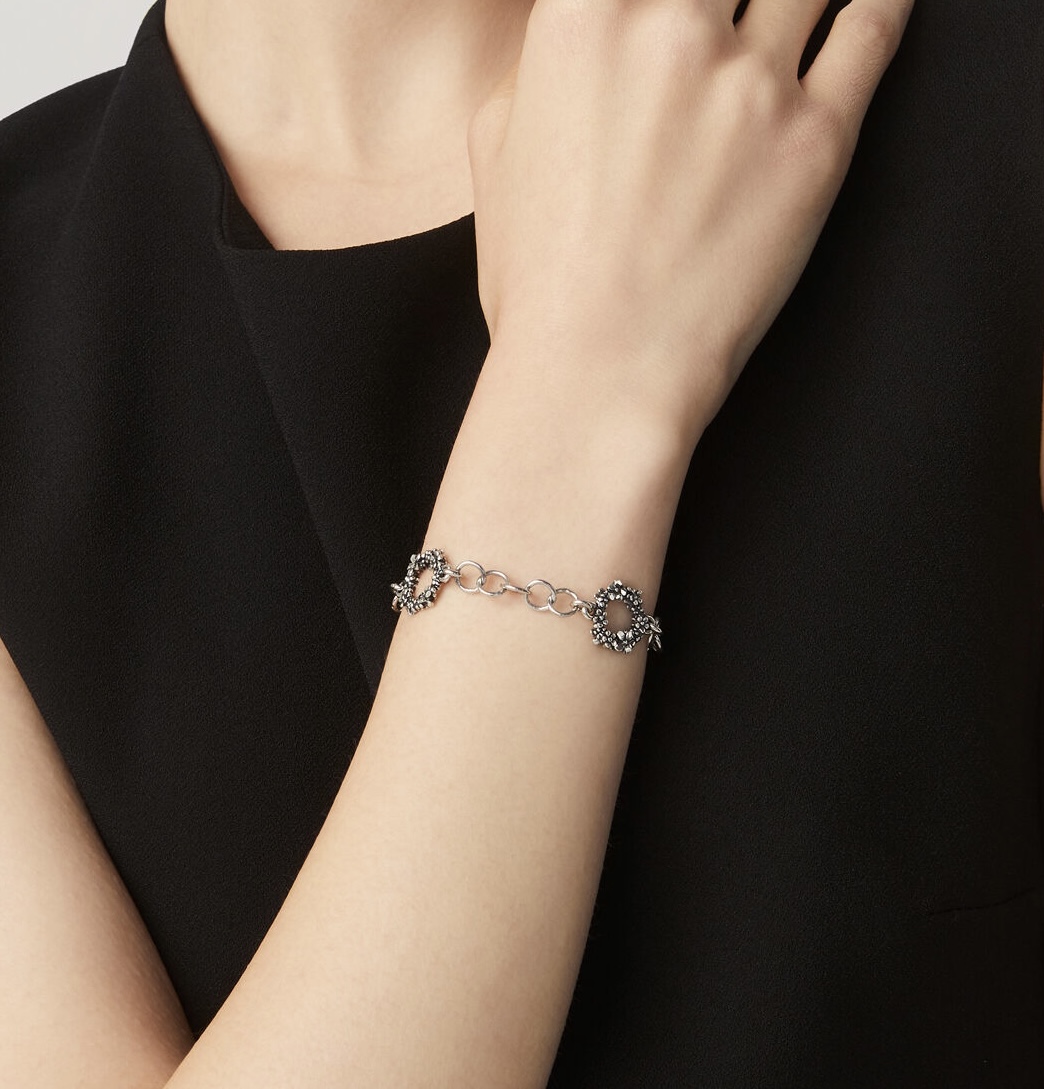 Un bracciale delicato e leggero, in cui la classica catena a maglia tonda si alterna a tre elementi circolari realizzati tramite fusione a cera persa e bruniti.Lunghezza cm 19