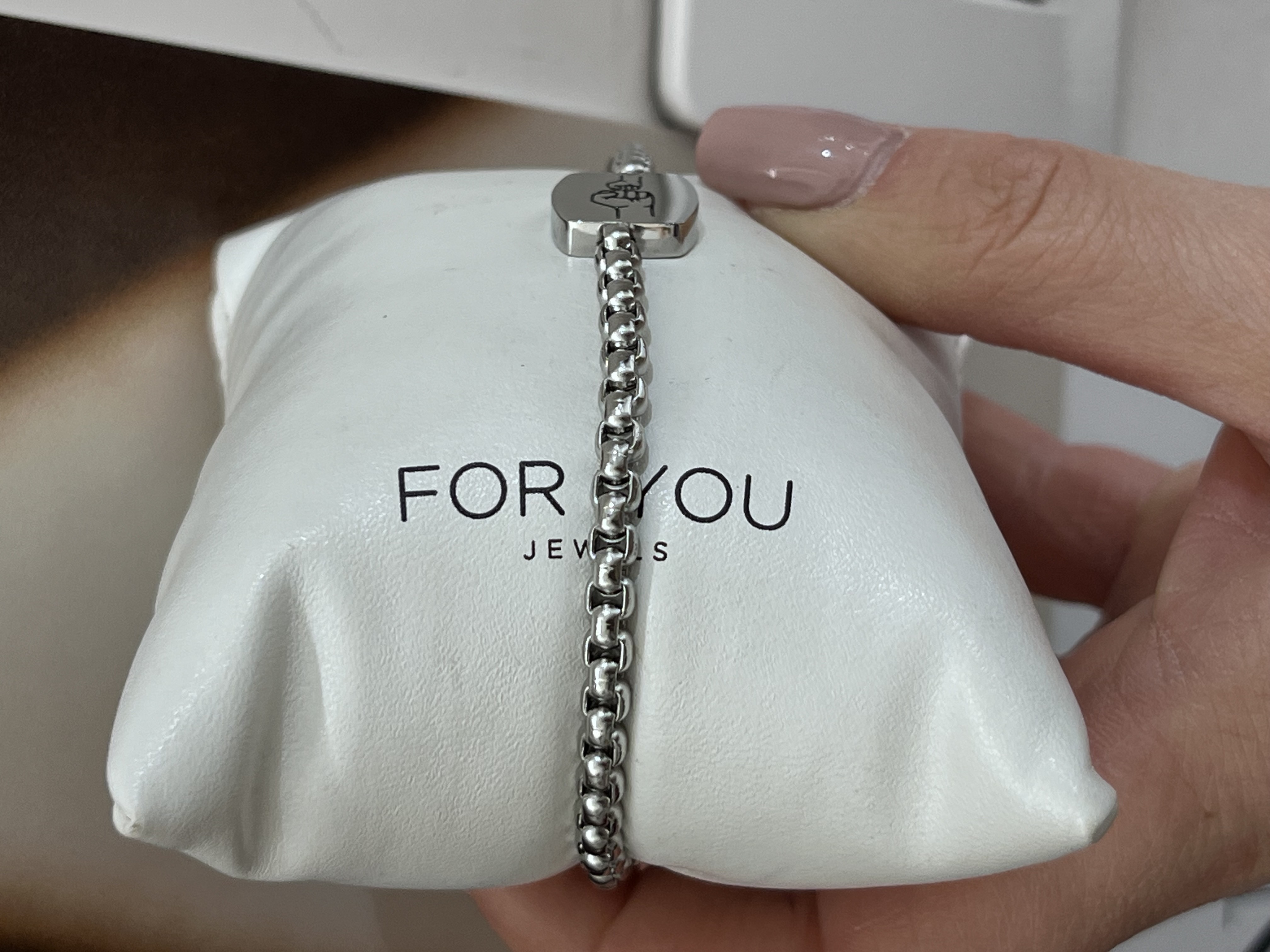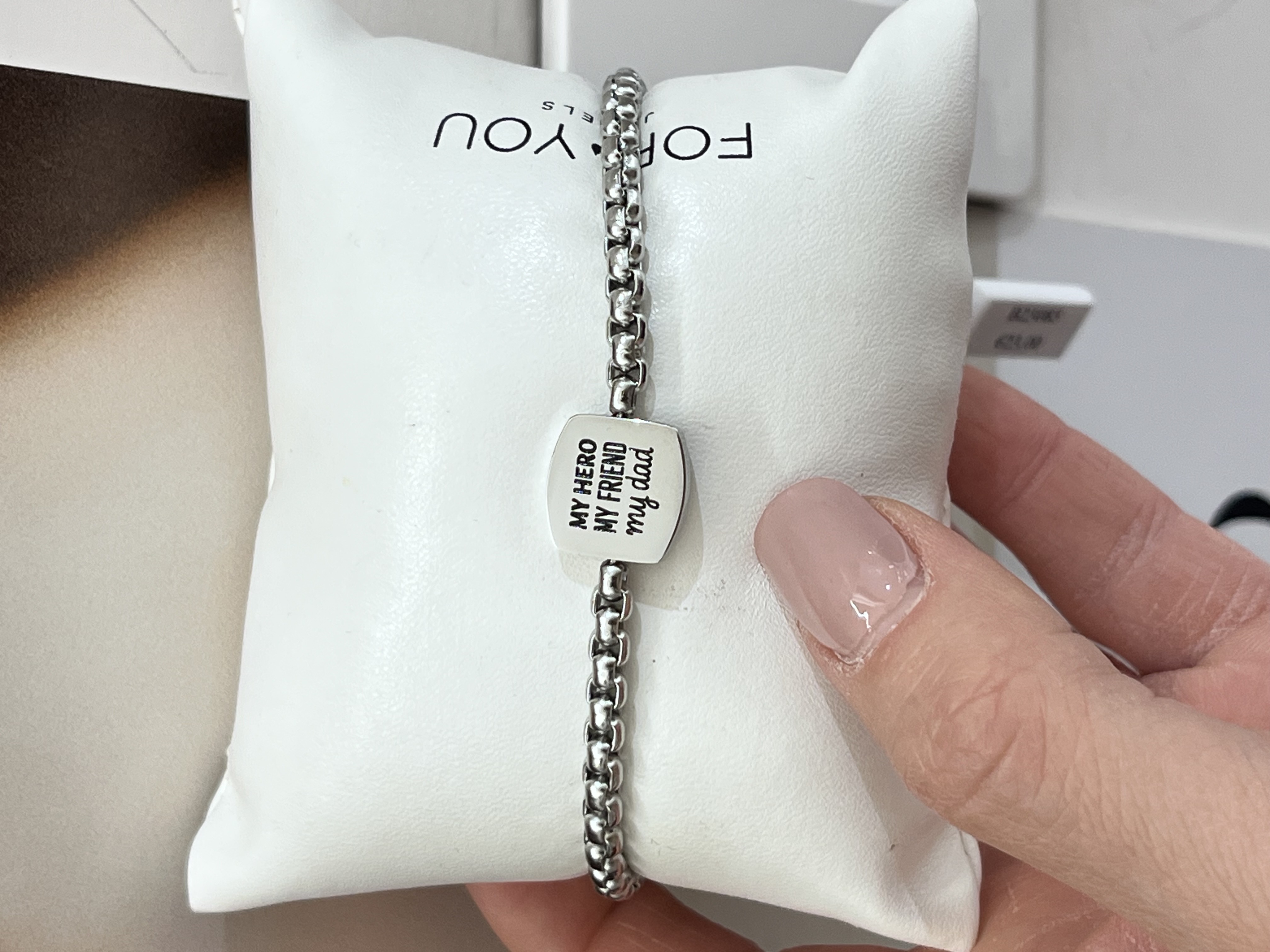 Bracciale in acciaio 18cm +3,5cm di estensione con piastra centrale smaltata con scritta in ambo i lati. Consegna entro 3gg lavorativi.