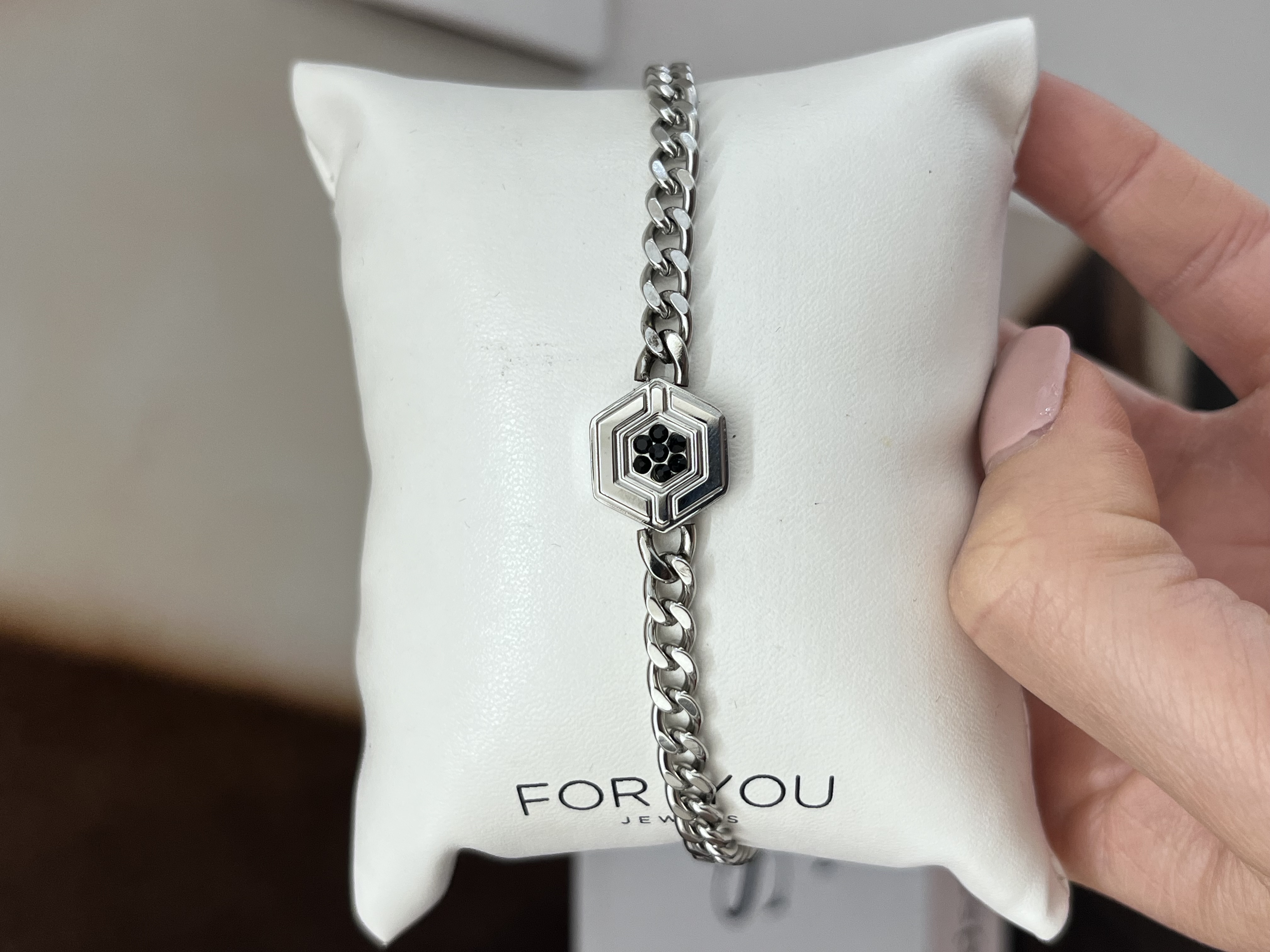 Bracciale in acciaio lunghezza 19cm +5cm di estensione. Da un lato la piastra reca una scrittura in smalto, dall‘altro lato presenta un inserto di pietre nere.