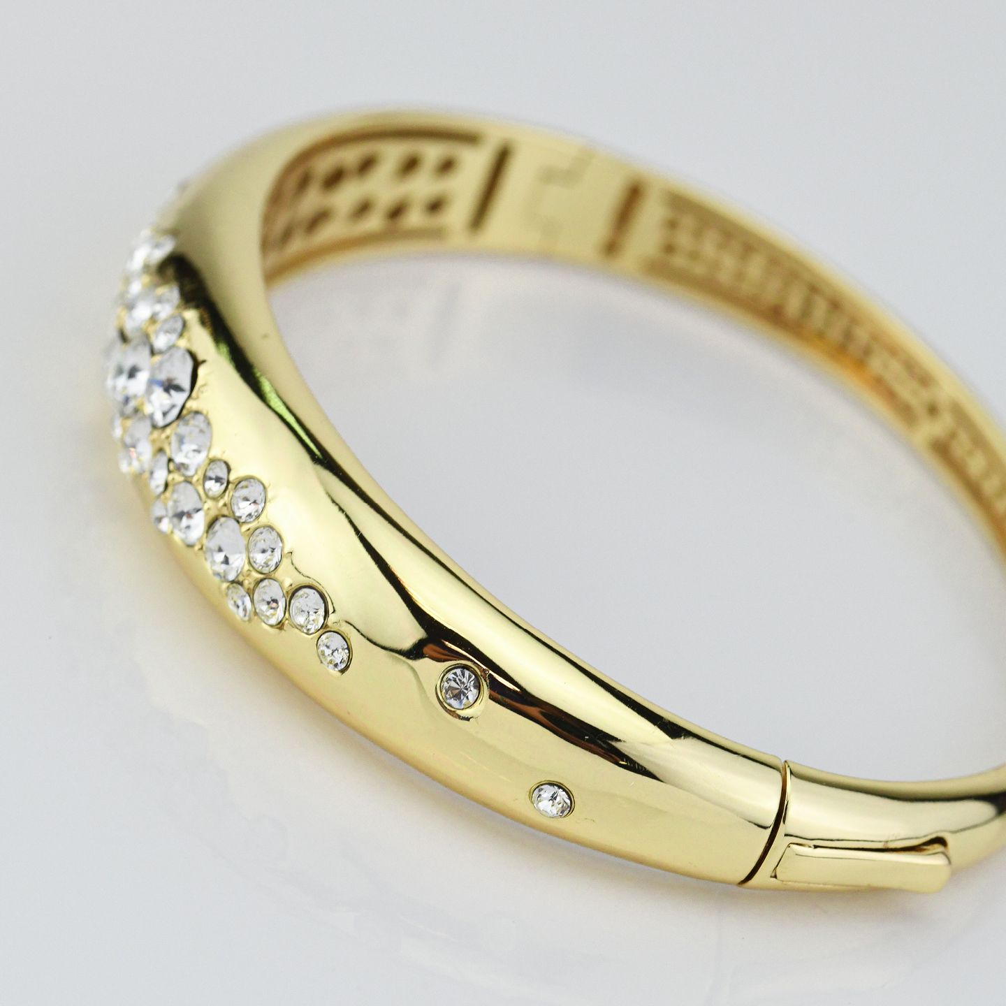 Bracciale rigido placcato oro giallo con ampio decoro centrale di cristalli crystal. Misura diametro 5,8 cm. Consegna entro 3gg lavorativi. Spedizione gratuita.