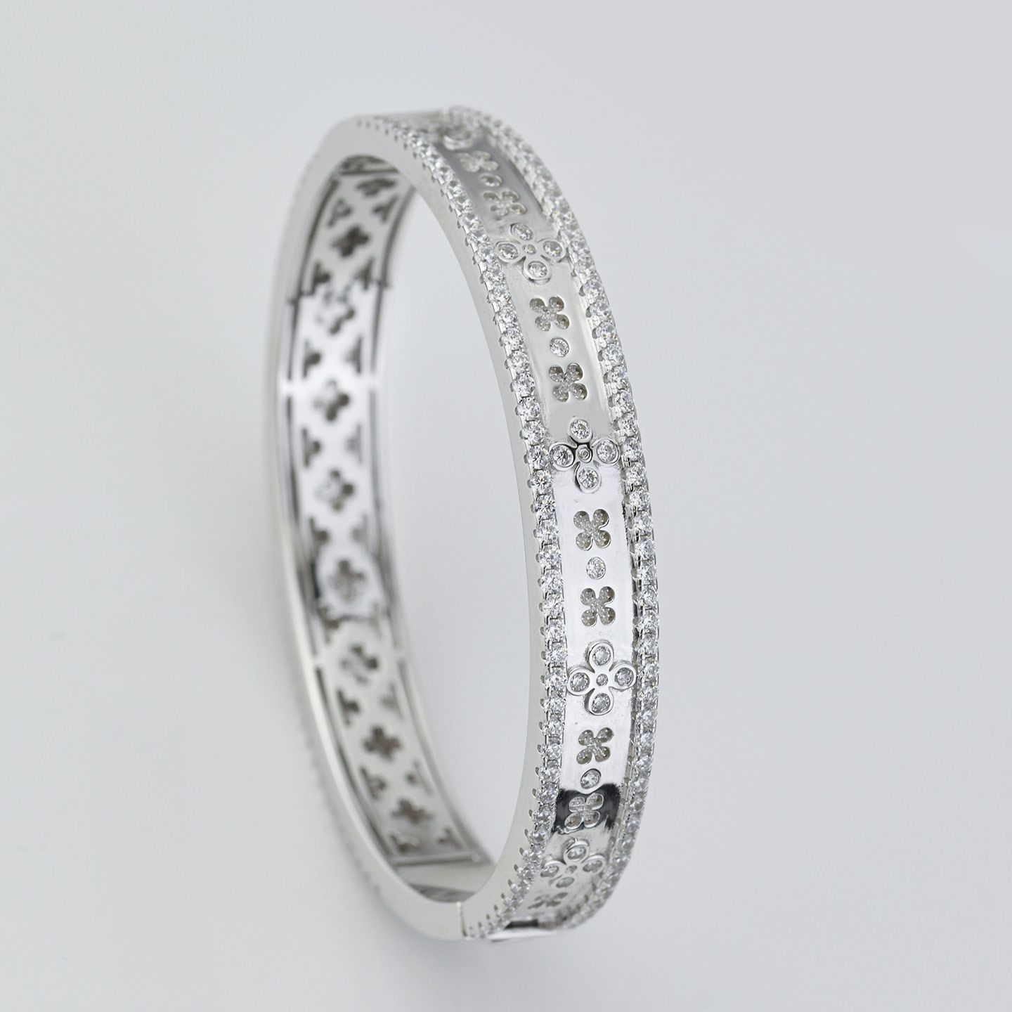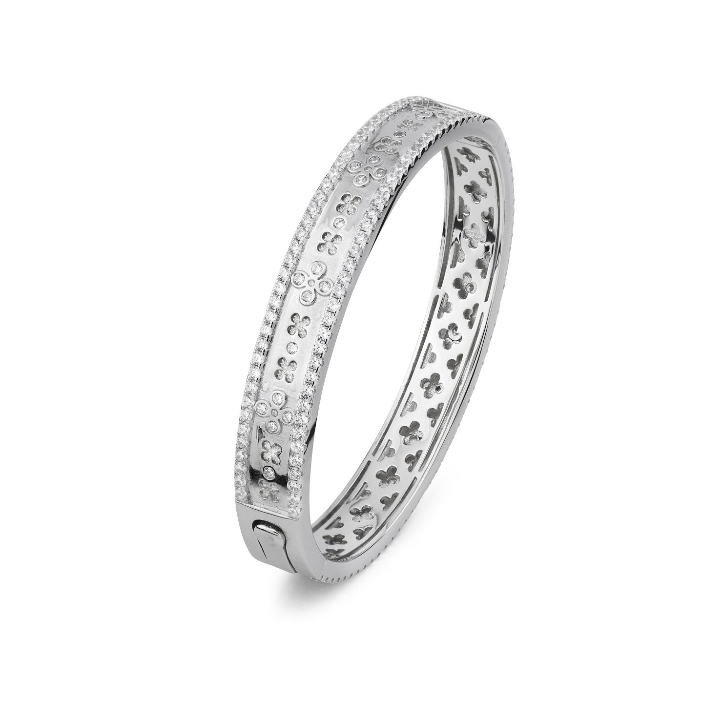Bracciale rigido rodiato con motivo floreale inciso e ripetuto lungo tutta la fascia con doppio giro di pietre. Dimensione: ovale cm 5×5,8; spessore cm 1. Consegna entro 3gg lavorativi. Spedizione gratuita.