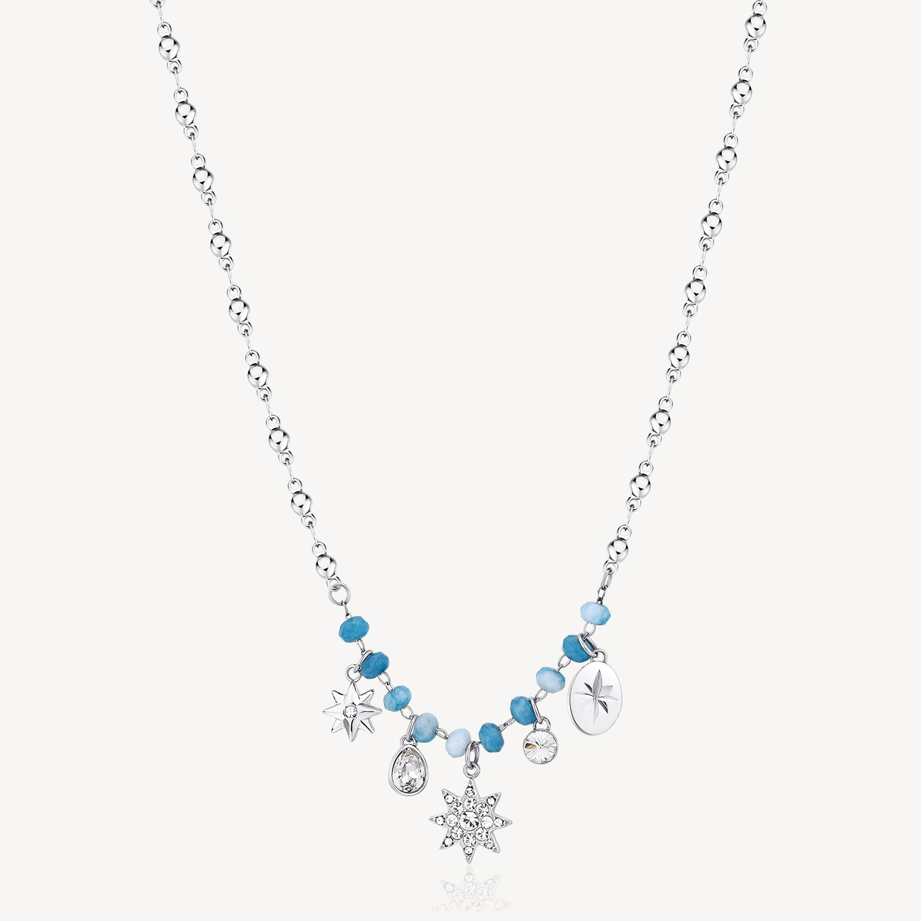 Collana in acciaio 316L, con calcedonio azzurro, pendenti a forma di stella e cristalli crystal. Consegna entro 3gg lavorativi.