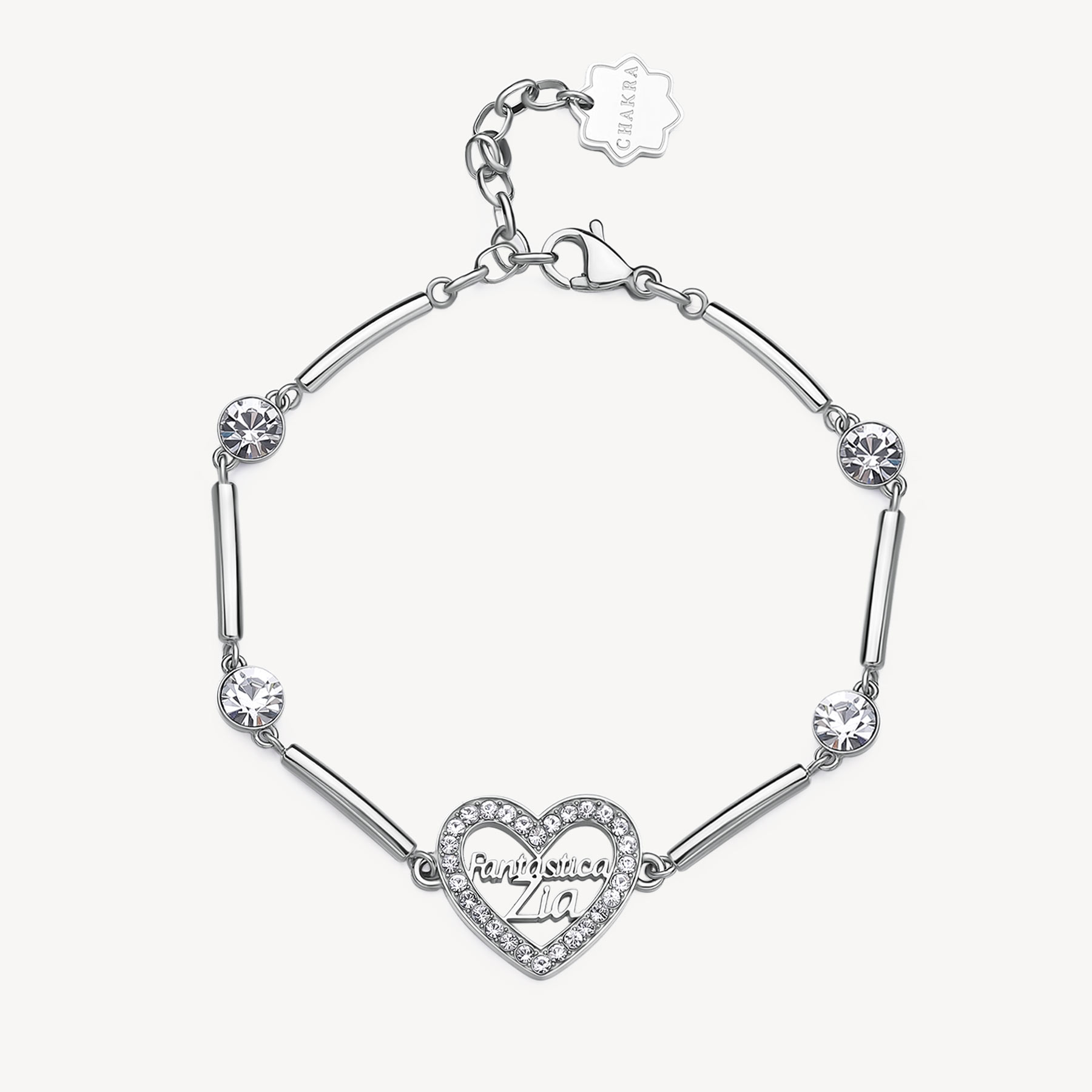 Bracciale semirigido in acciaio 316L con centrale a forma di cuore con scritta “Fantastica Zia” e cristalli. Misura 18.5. Consegna entro 3gg lavorativi.