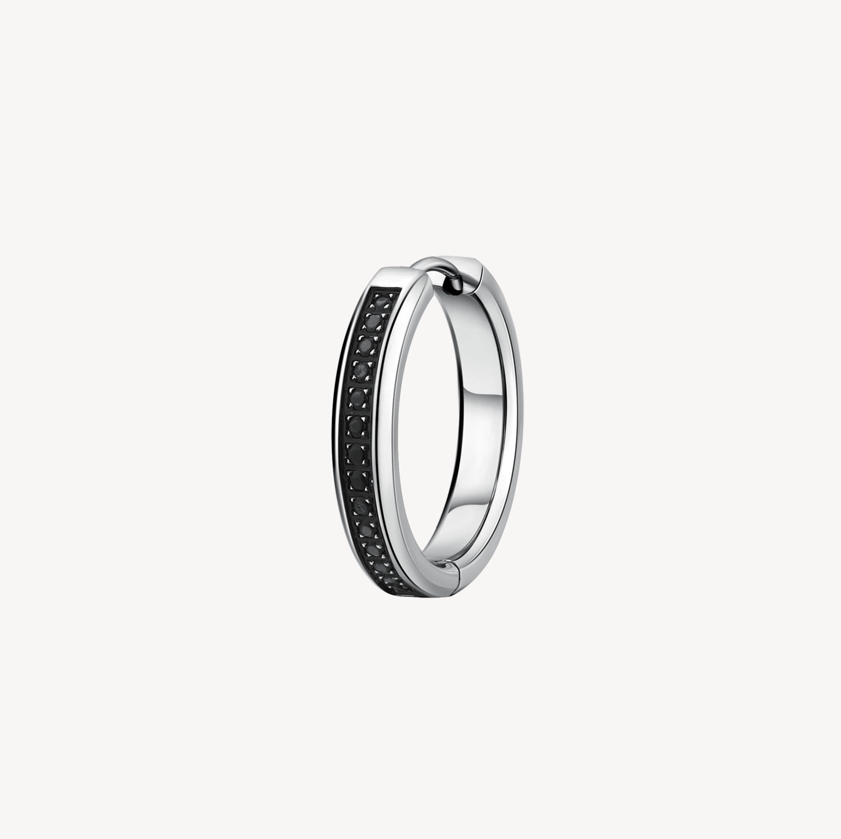Orecchino singolo a cerchio in acciaio 316L e zirconi neri. Consegna entro 3gg.