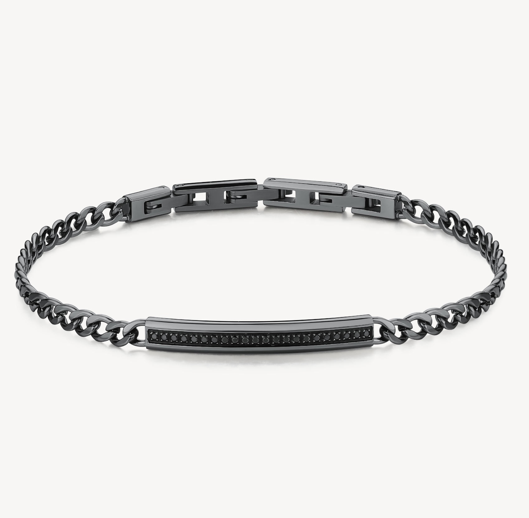 Bracciale catena grumetta in acciaio 316L, finitura color rutenio e zirconi neri. Lunghezza bracciale 19 cm con estensione a 22 cm. Consegna entro 3gg.