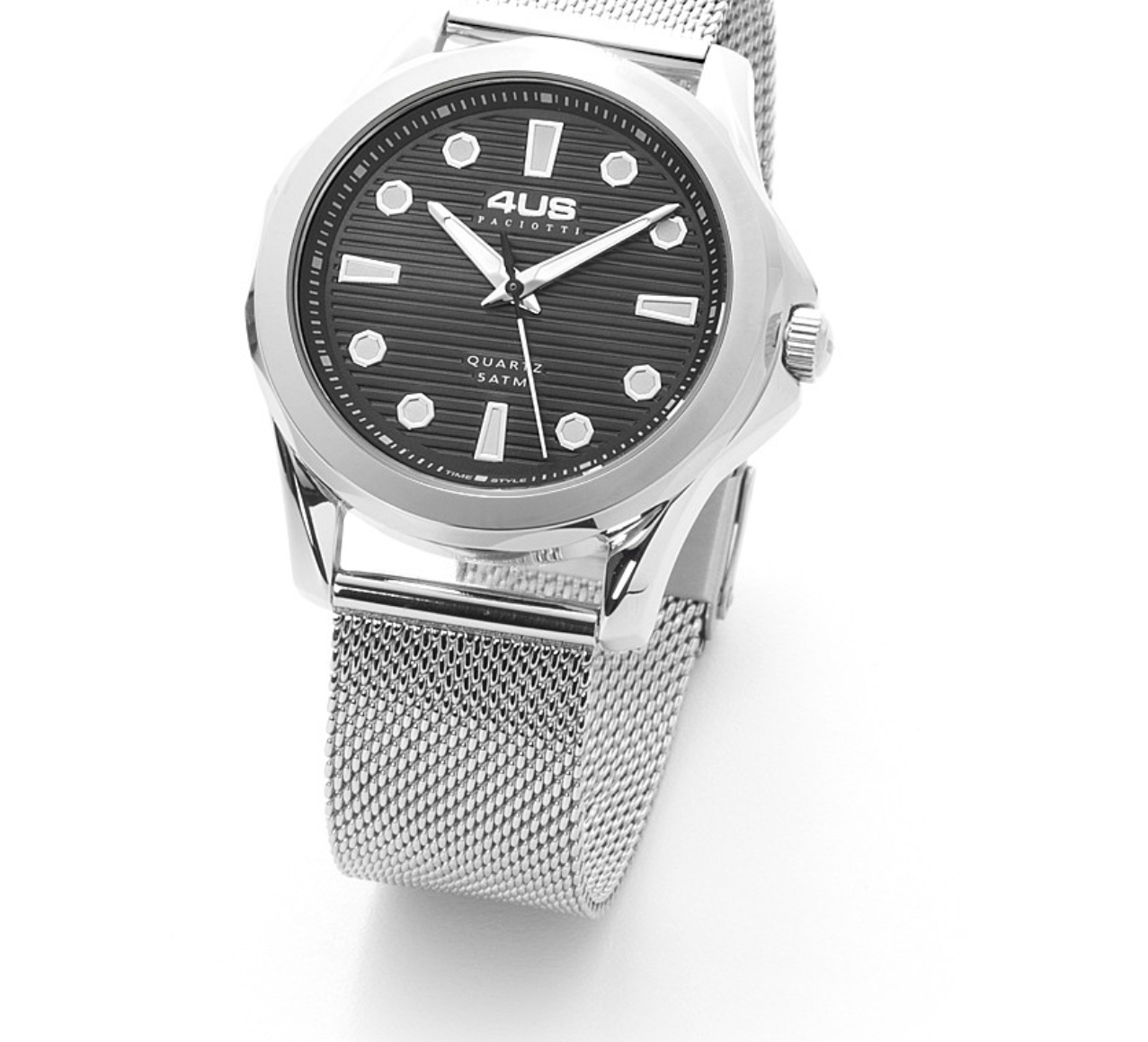 Orologio solo tempo di Cesare Paciotti, realizzato in acciaio di colore argento. Il quadrante è nero con movimento Miyota 2035, indici di colore argento e lancette luminose. La cassa ha una dimensione di 40 mm, ghiera lucida, chiusura a coulisse e fondello a pressione logato. Il cinturino è in maglia milanese acciaio resistente all’acqua 5 atm.Consegna entro 3gg lavorativi.Spedizione gratuita.