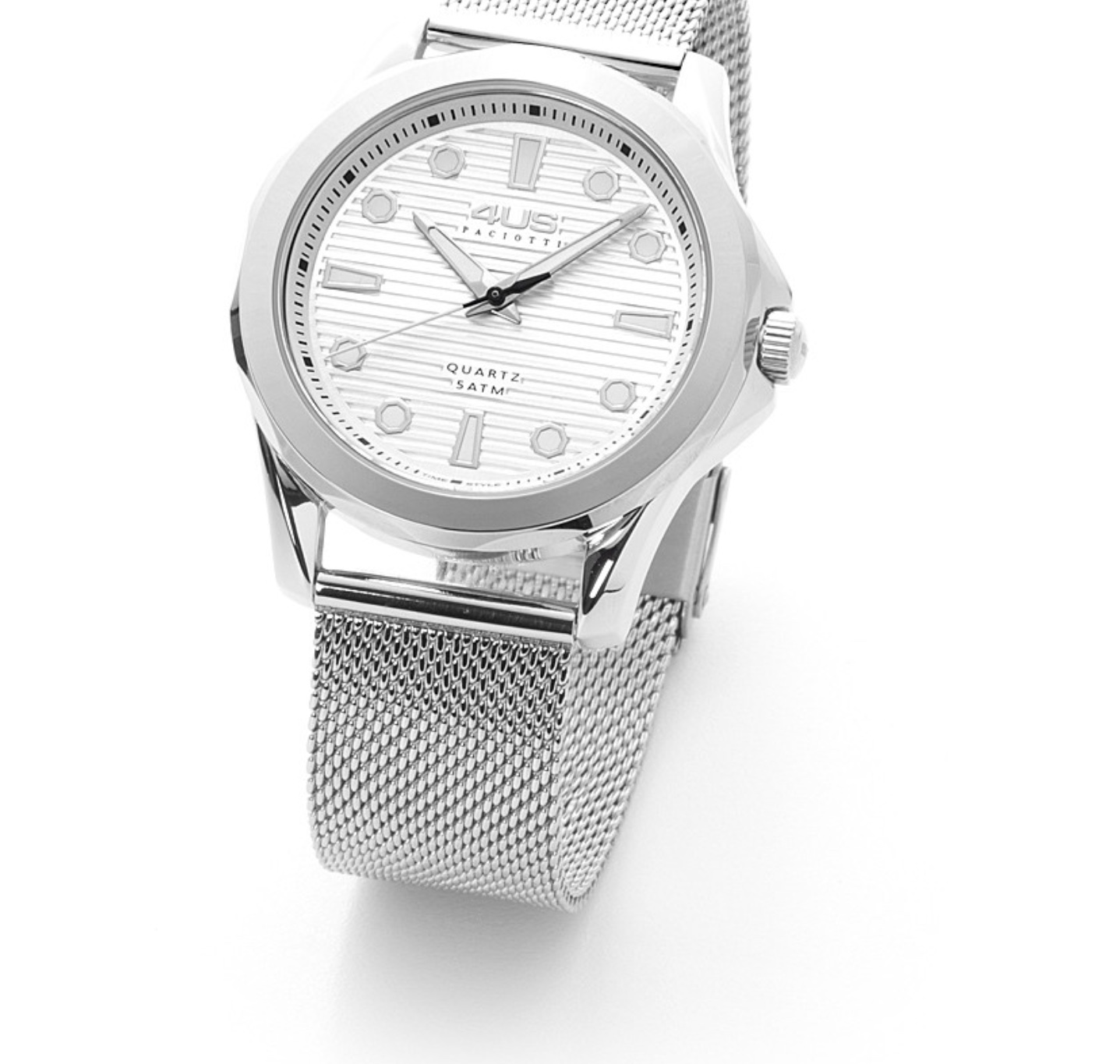 Orologio solo tempo di Cesare Paciotti, realizzato in acciaio di colore argento. Il quadrante è argento con movimento Miyota 2035, indici di colore argento e lancette luminose. La cassa ha una dimensione di 40 mm, ghiera lucida, chiusura a coulisse e fondello a pressione logato. Il cinturino è in maglia milanese acciaio resistente all’acqua 5 atm.Consegna entro 3gg lavorativi.Spedizione gratuita.