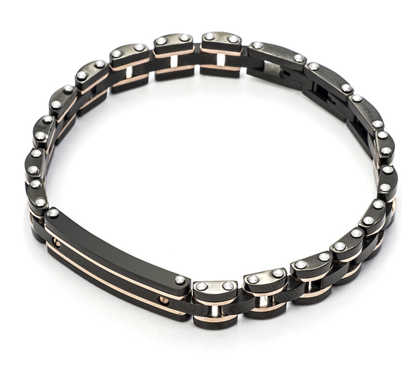Bracciale con piastra centrale logata del brand 4US Cesare Paciotti. Gioiello realizzato in acciaio, con finitura in pvd nero e rose gold. La chiusura è a cassetta e misura: cm 21.Consegna entro 3gg lavorativi.