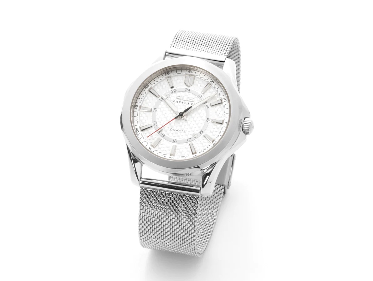 Orologio solo tempo di Cesare Paciotti, realizzato in acciaio di colore argento. Il quadrante è argento con movimento Miyota 2035, indici di colore argento e lancette luminose. La cassa ha una dimensione di 40 mm, ghiera lucida, chiusura a coulisse e fondello a pressione logato. Il cinturino è in maglia milanese acciaio resistente all’acqua 5 atm.Consegna entro 3gg lavorativi.Spedizione gratuita.