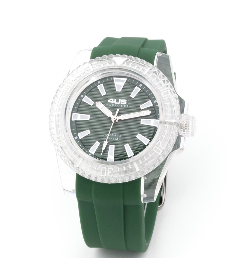 Orologio da uomo della marca 4US di Cesare Paciotti, il solo tempo ha un meccanismo al quarzo con batteria, la cassa misura 39 mm in plastica lucida, il quadrante è verde con lavorazione fantasia ed lancette ed indici in acciaio, il cinturino è in silicone di colore verde, la ghiera è in plastica con numeri per profondimetro, il vetro è in plastica leggermente bombato, la corona è a trascinamento, la resistenza all’acqua è di 5 atm. Consegna entro 3gg lavorativi.