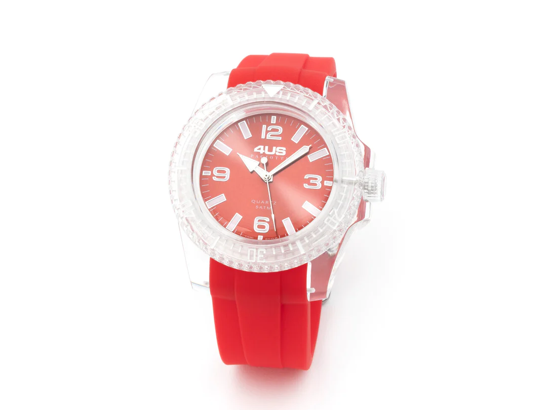 Orologio da uomo della marca 4US di Cesare Paciotti, il solo tempo ha un meccanismo al quarzo con batteria, la cassa misura 39 mm in plastica lucida, il quadrante è rosso con lavorazione liscia ed lancette ed indici in acciaio, il cinturino è in silicone di colore rosso, la ghiera è in plastica con numeri per profondimetro, il vetro è in plastica leggermente bombato, la corona è a trascinamento, la resistenza all’acqua è di 5 atm. Consegna entro 3gg lavorativi.