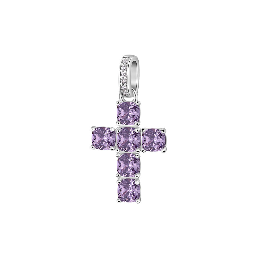 Pendente a forma di croce in argento rodiato 925‰ con cushion cubic zirconia colore amethyst.