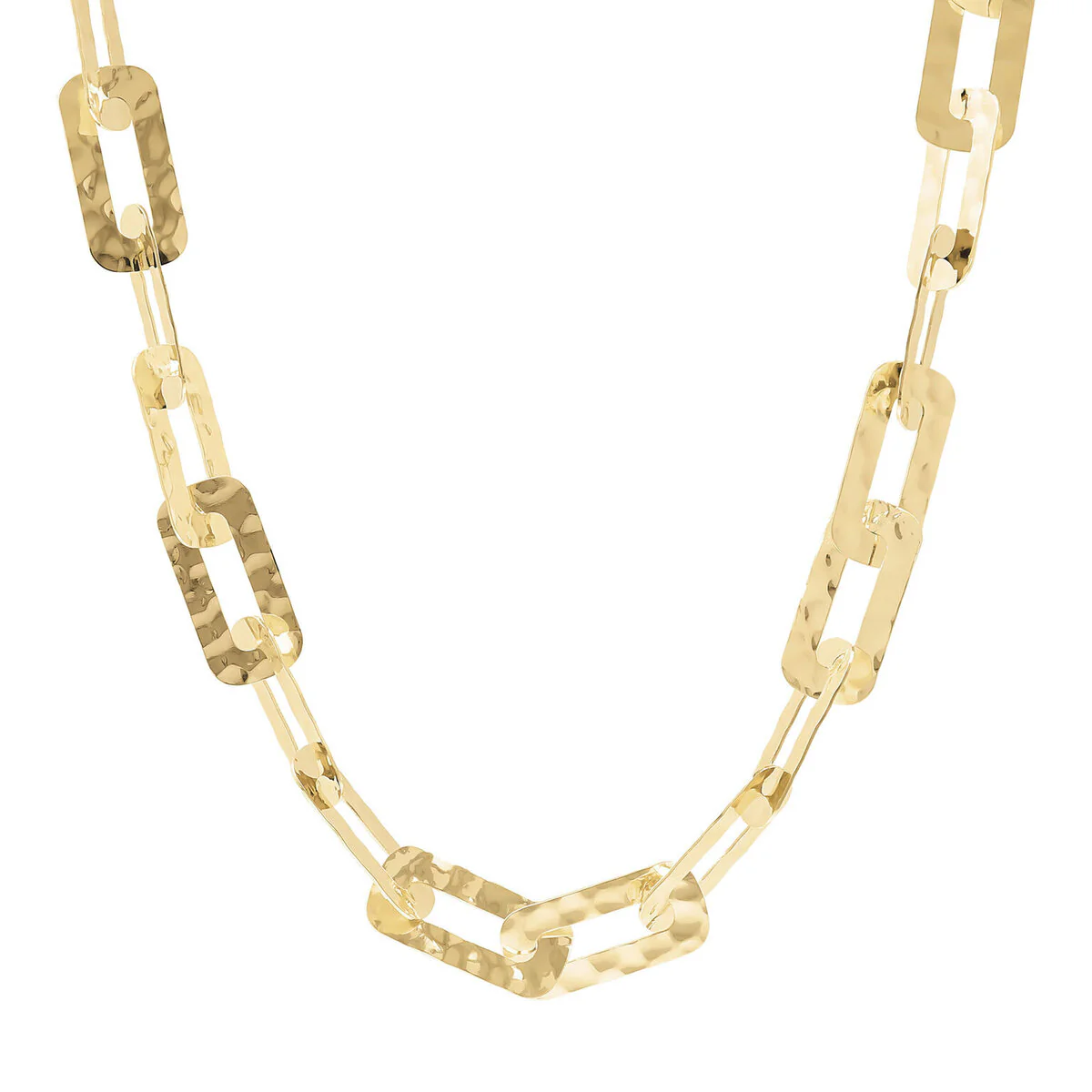 Collana Etrusca Gioielli montata su base Golden, placcata oro giallo 18kt, impreziosita da una catena con maglie rettangolari piatte dalla superficie martellata; chiusura a moschettone. Disponibile nella misura long (81 cm).Consegna entro 3gg.