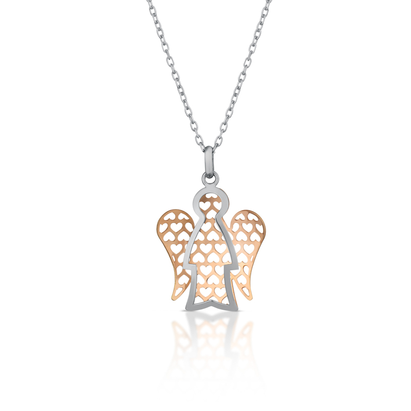Collezione Angeli 9kt,collana in oro bianco con pendente angelo in oro bianco e ali in oro rosa – lunghezza catena 42/45 cm – angelo: base 1,7 cm – altezza 2,1 cm.Consegna entro 3gg. Spedizione gratuita.