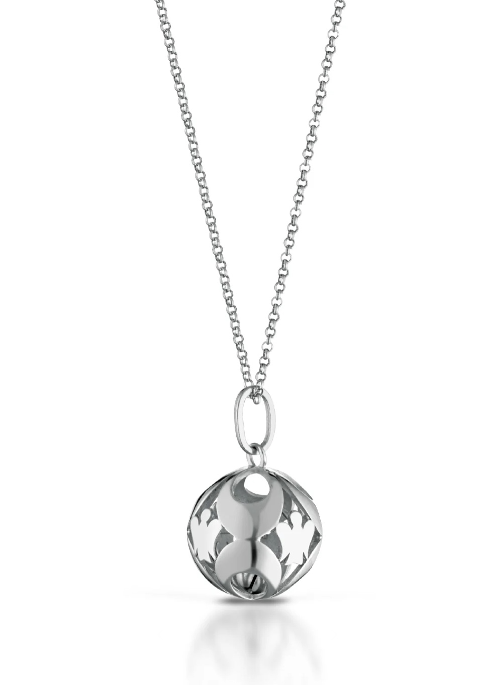 Collana da Donna modello chiama Angeli realizzato da una catena rolò diamantata lucida in Argento Bianco 925, rappresenta una biglia traforata a forma di cuori con zirconi incastoanti ed angeli lucidi alternati con sonaglino all’interno. La lunghezza è 90 cm. Il diametro della sfera è di 2 cm. La chiusura è con maglia a moschettone. Consegna entro 3gg lavorativi.Spedizione gratuita.