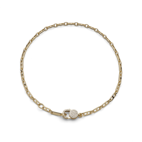 Choker in catena sottile traversino con bagno in oro e chiusura a moschettone con pavé di zirconi. Misura 35,00. Questa collana choker dalla linea affusolata può anche essere indossata a doppio giro come un bracciale. Consegna entro 3gg lavorativi. Spedizione gratuita.