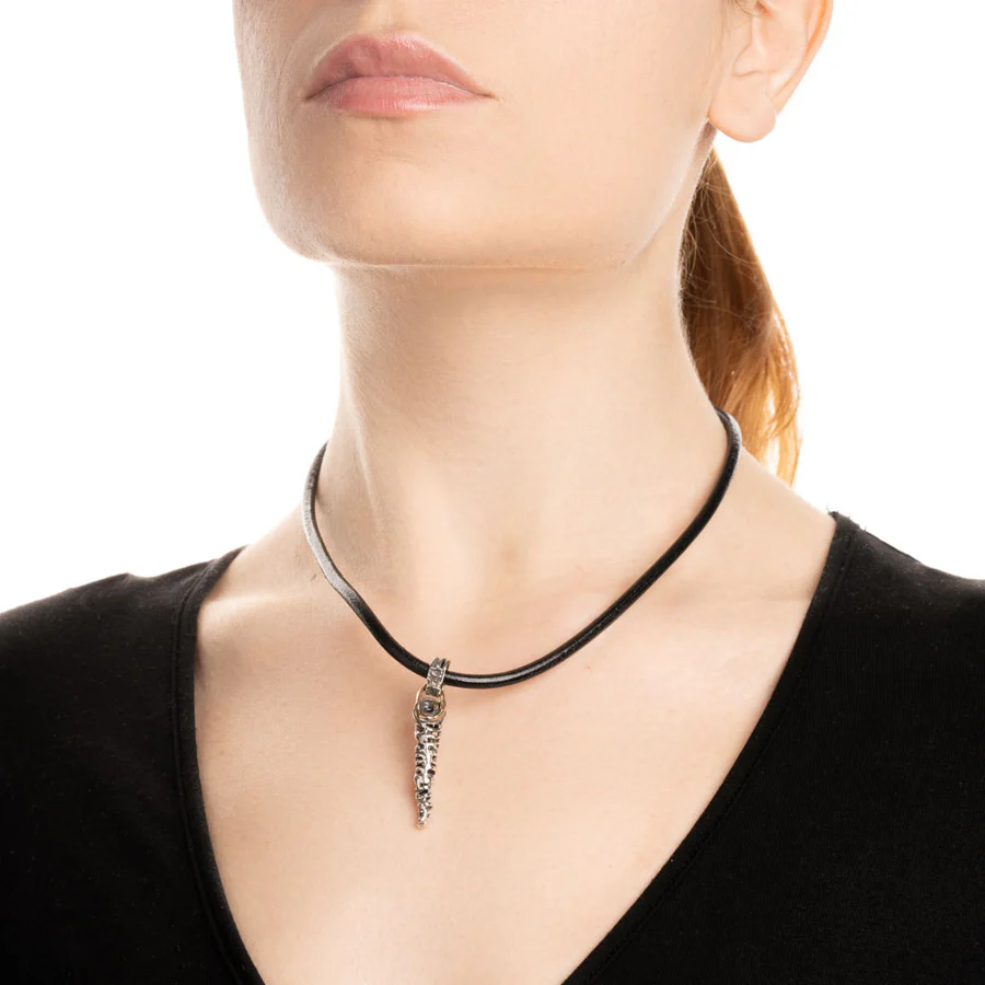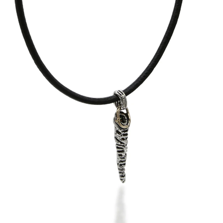 Collana con pendente a forma di piccolo cono realizzato con fili di argento e bronzo. Cordino in vero cuoio nero/marrone, chiusura artigianale T-BAR. Realizzato a mano in Italia. Consegna entro 3gg lavorativi. Spedizione gratuita.
