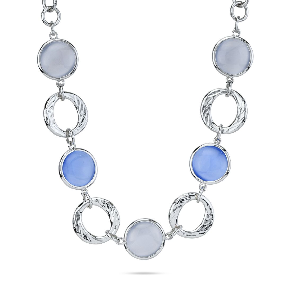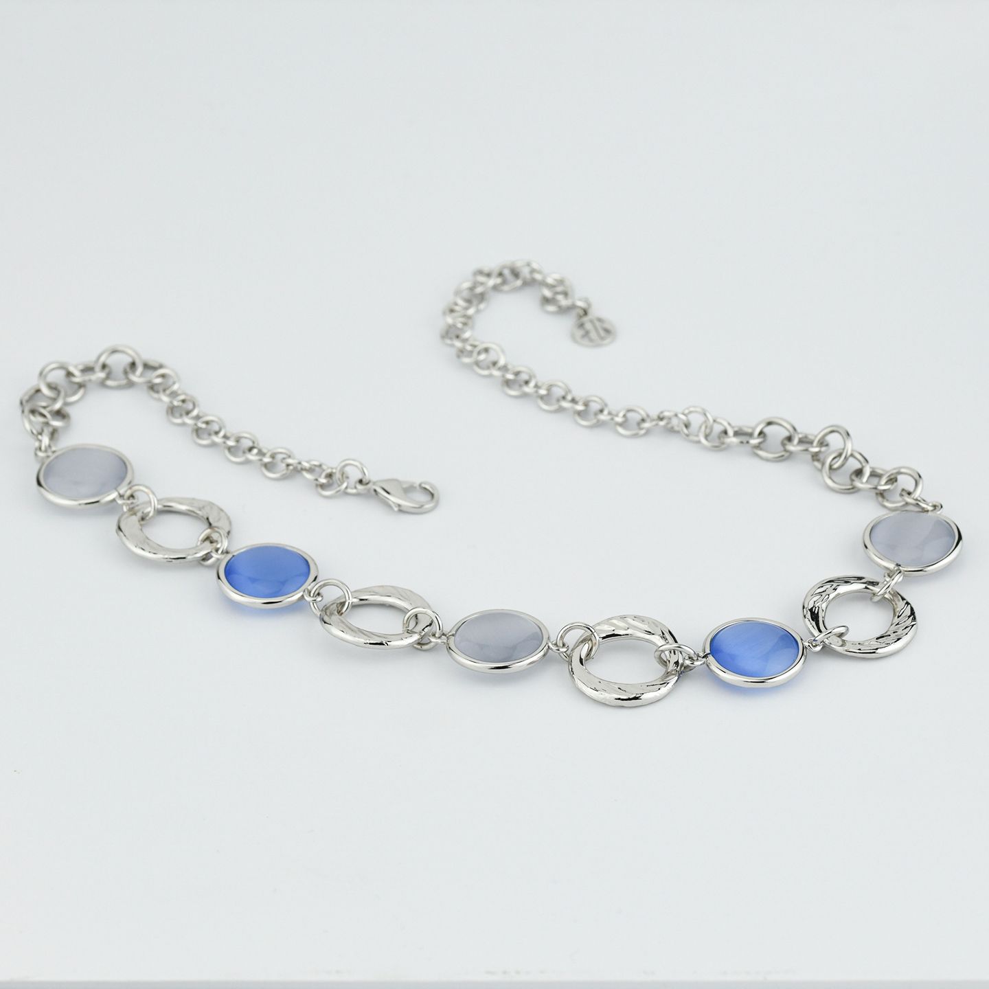 Collana rodiata con cristalli effetto cabochon di colore blu marino e grigio, tra moduli martellati. Misura 42 cm estendibile a 49 cm. Consegna entro 3gg lavorativi. Spedizione gratuita.
