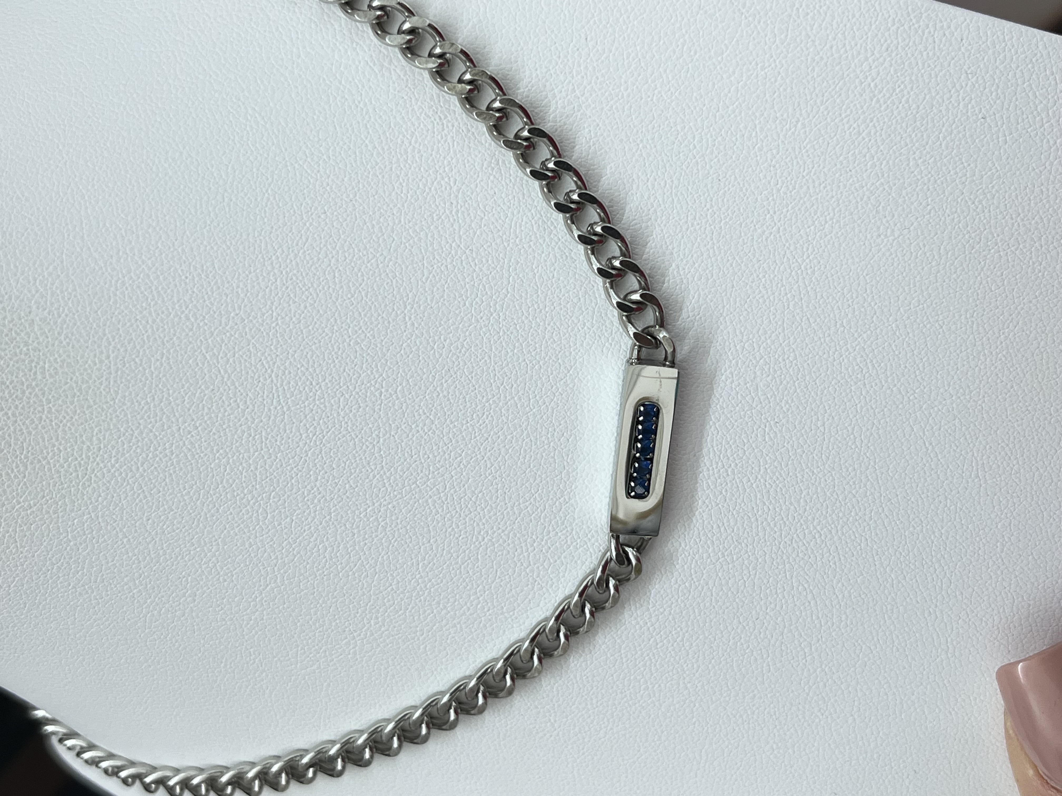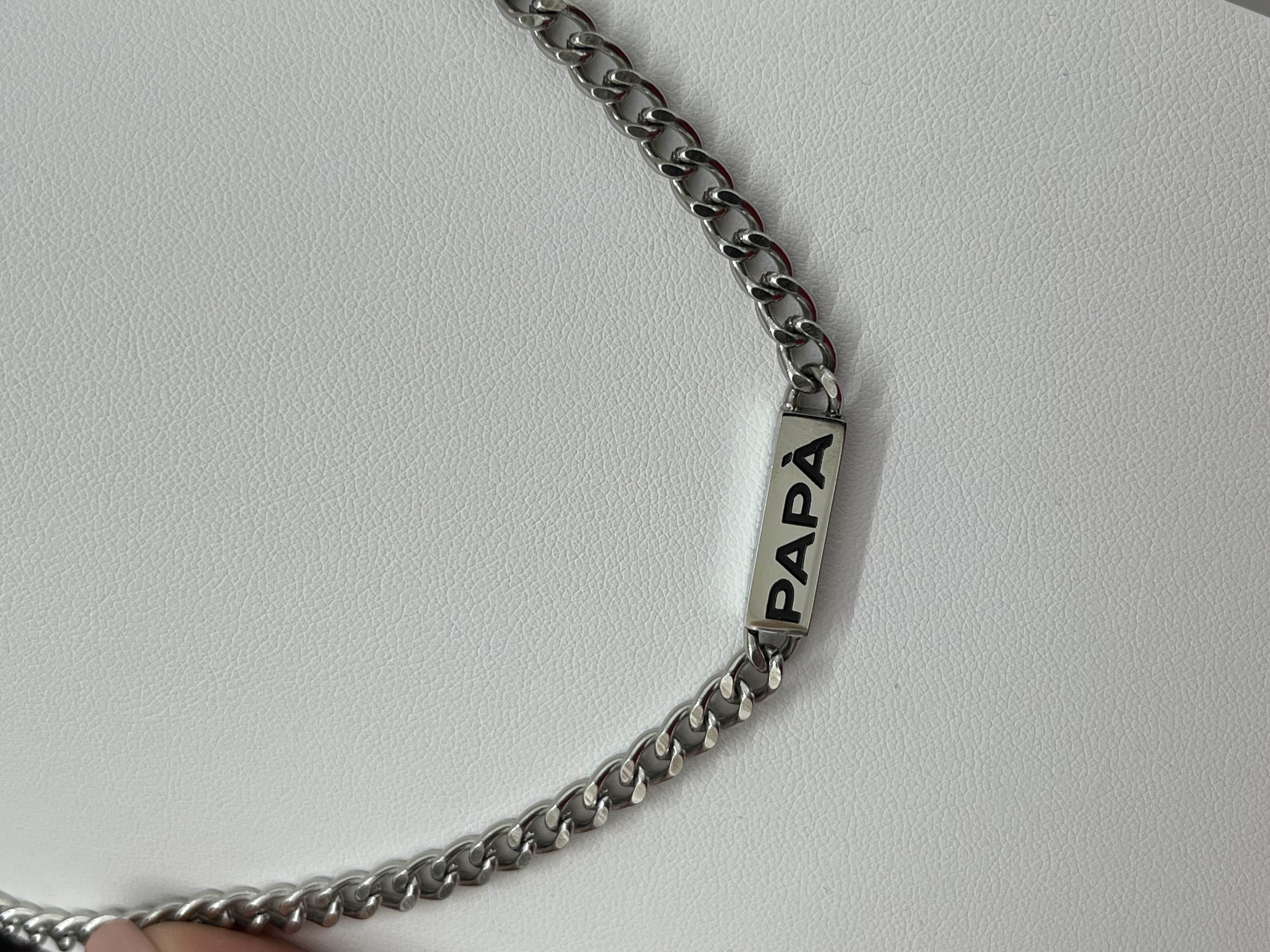 Collana modello grumette in acciaio lunga 50cm +5cm di estensione. Presenza di una piastra con la scritta Papà da un lato e dall’altra la presenza di zirconi blu.