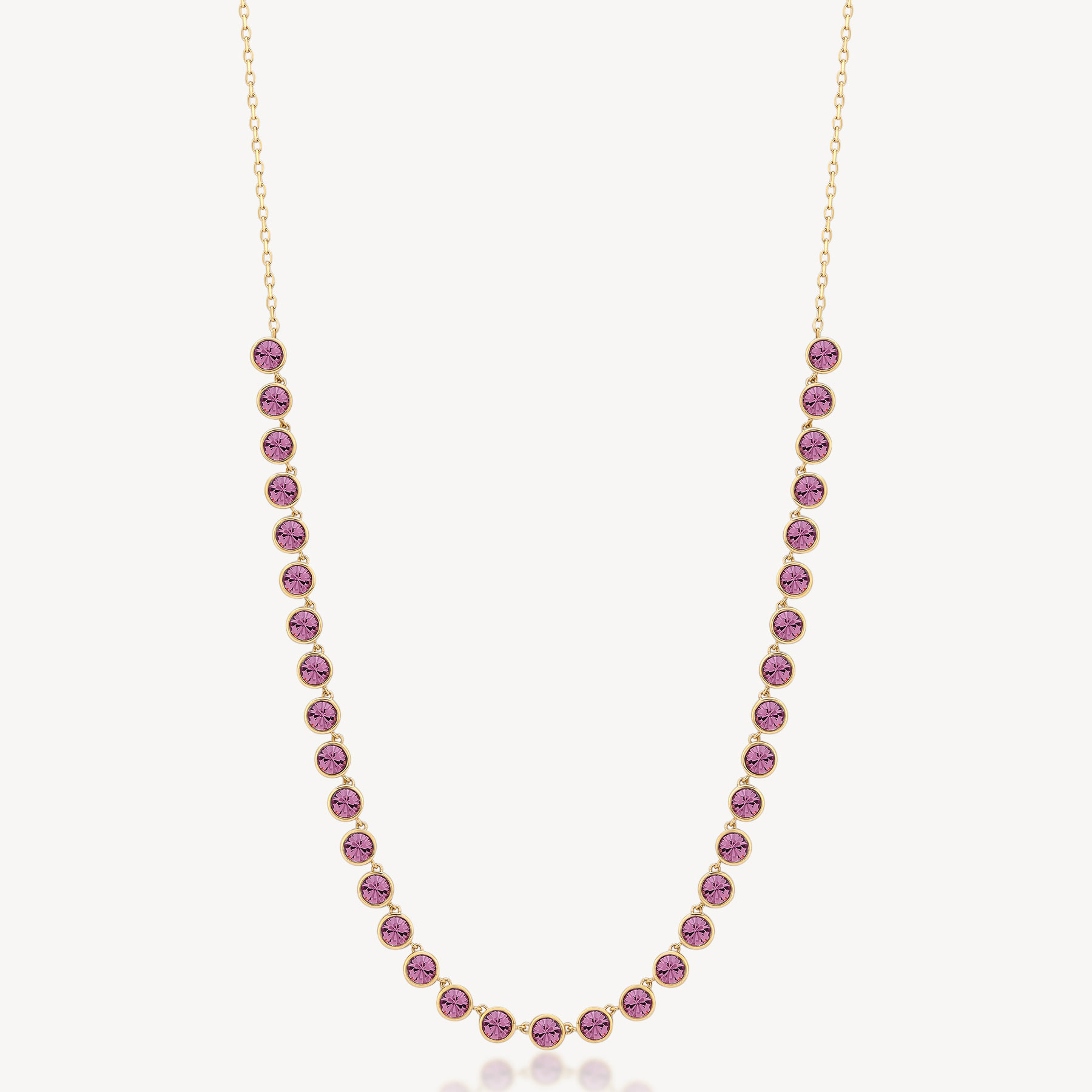Collana girocollo in acciaio 316L, finitura pvd oro 14K con cristalli colore light amethyst. Misura 45 cm con tondino scorsoio per poter regolare la catenina. Consegna entro 3gg lavorativi.