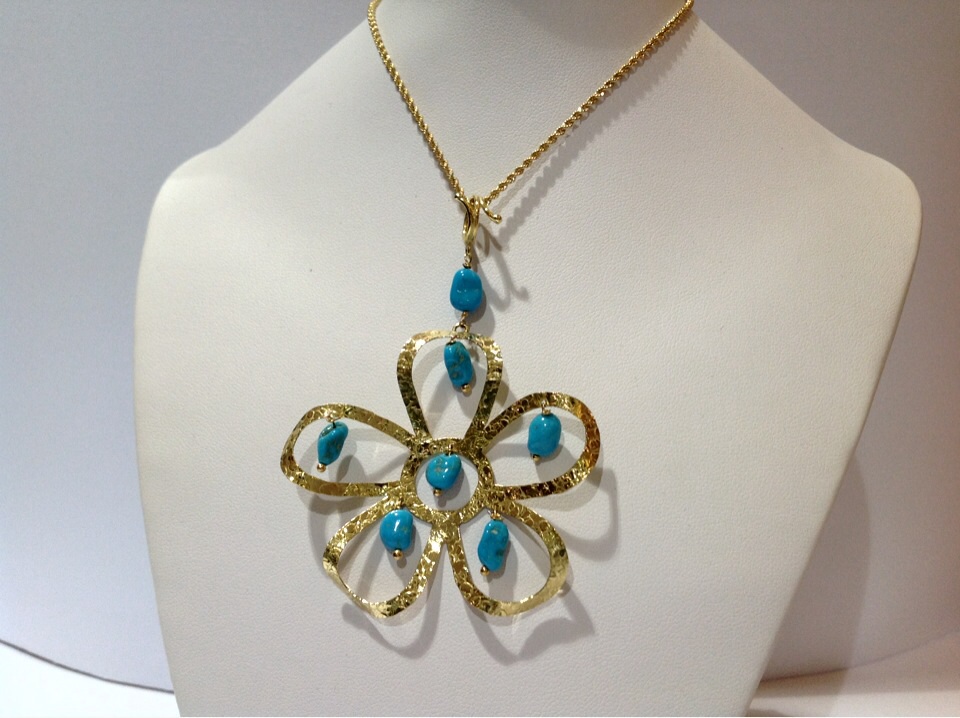 Girocollo in oro giallo 18kt della lunghezza di 50cm più pendente modello fiore,in oro giallo 18kt con turchese originale non trattato. Consegna entro 3gg lavorativi. Spedizione assicurata e gratuita.