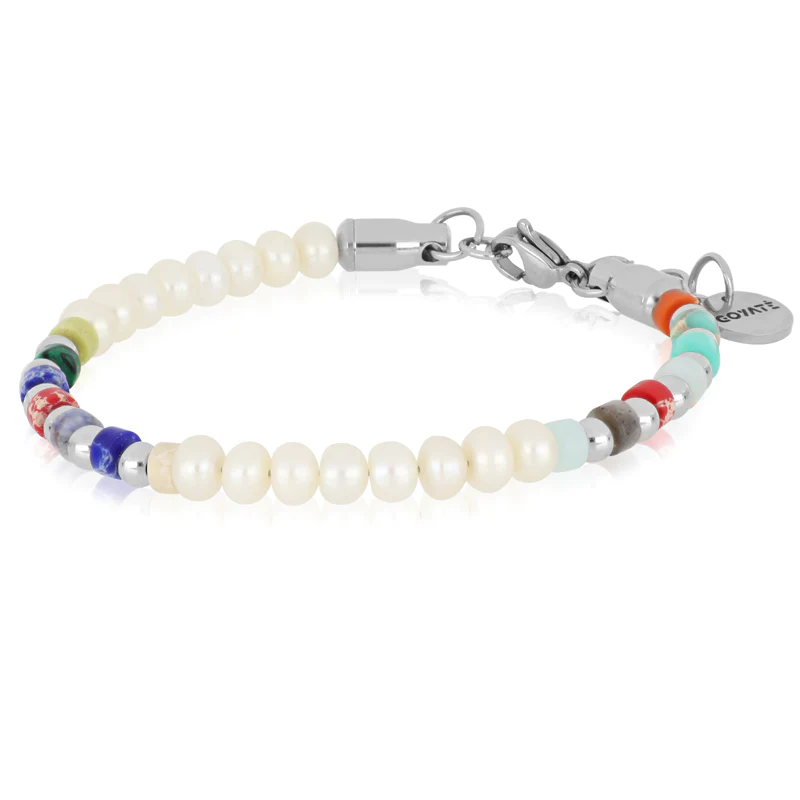 Bracciale da uomo in acciao anallergico con perle di fiume e agate colorate. Misura 16,5 cm regolabile fino a 20 cm. Consegna entro 3gg lavorativi.