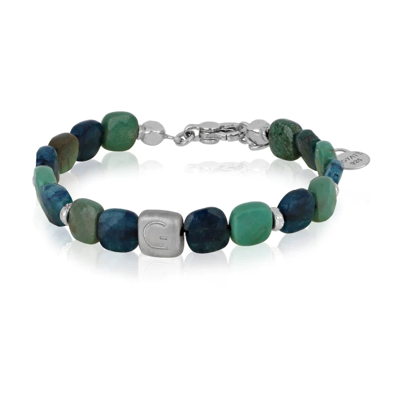 Bracciale da uomo in argento 925 con pietre crisoprasio e apatite blu.Il bracciale misura 18 cm con estensione a 21 cm con chiusura a moschettone. Consegna entro 3gg lavorativi.