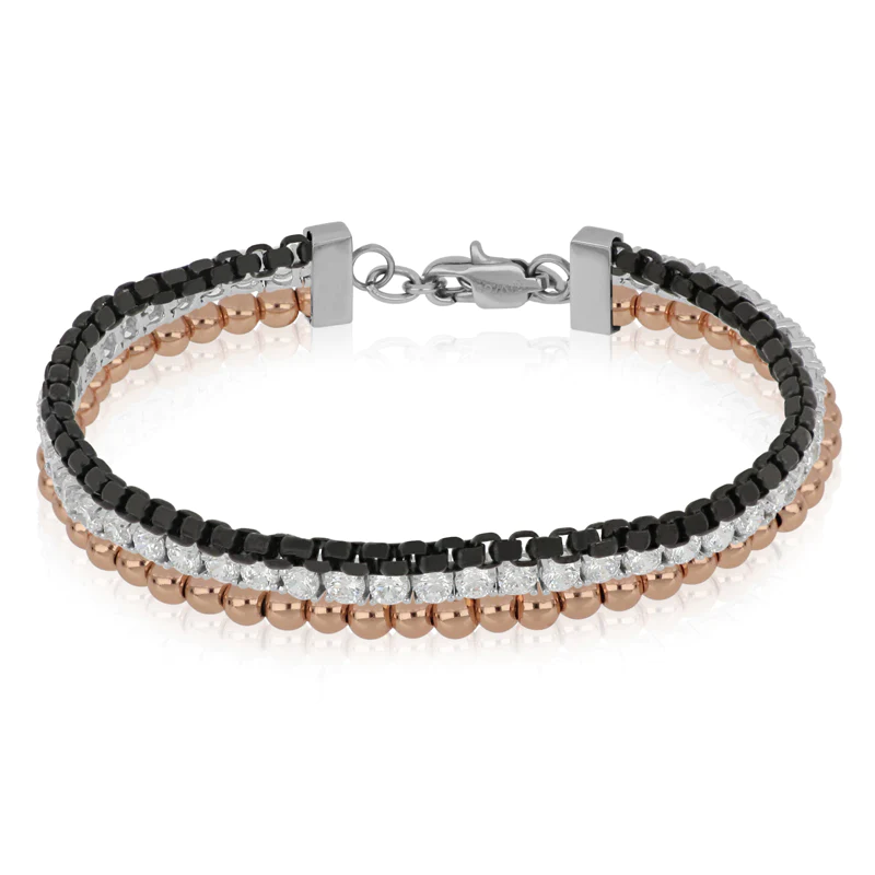 TENNIS UOMO CON CATENE IN ACCIAIO NERO E ROSA MISURA REGOLABILE DA 18 a 21 CM. CONSEGNA Entro 3gg Lavorativi.