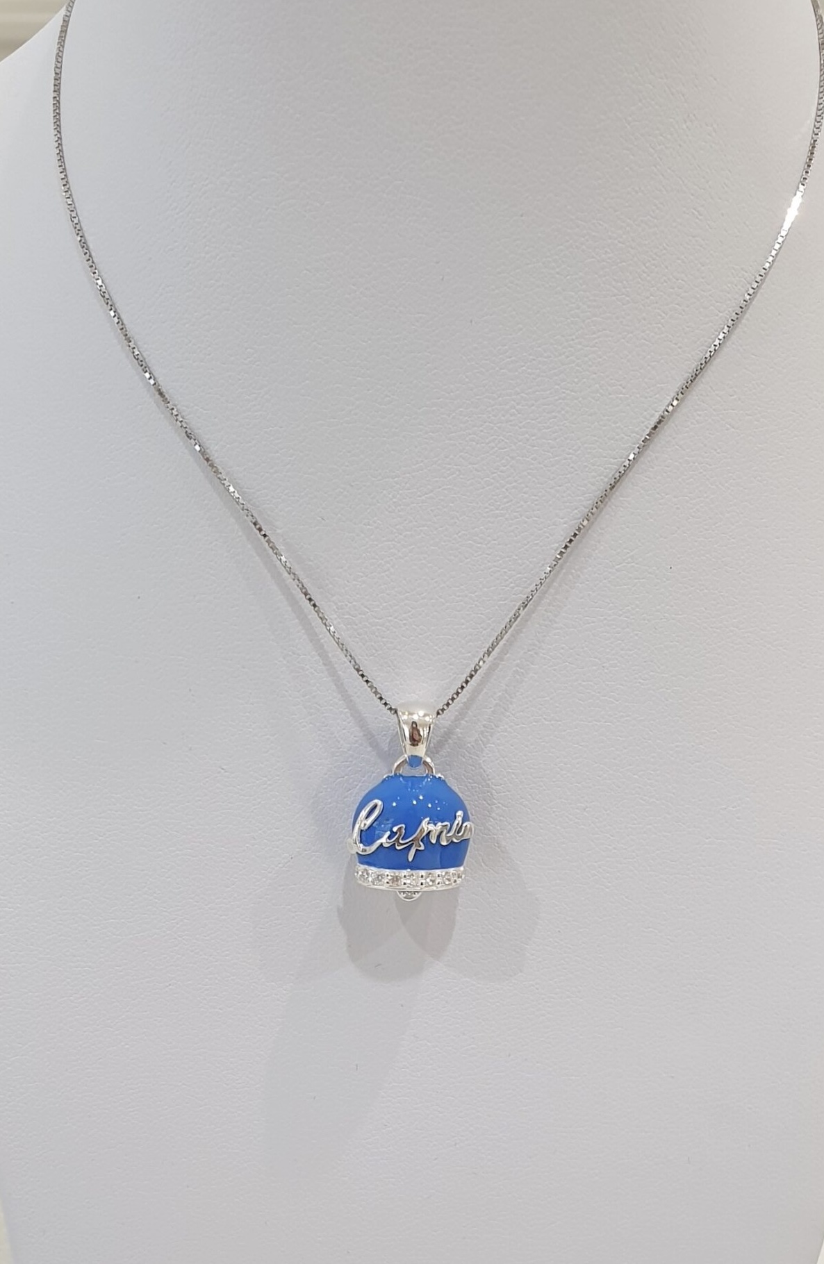 Collana in argento 925 composta da una catenina, modello veneziana,lunga 45cm e campanella smaltata colore blu con giro di zirconi. L’altezza della campanella con contromaglia misura 2 cm. Consegna entro 3 gg lavorativi.