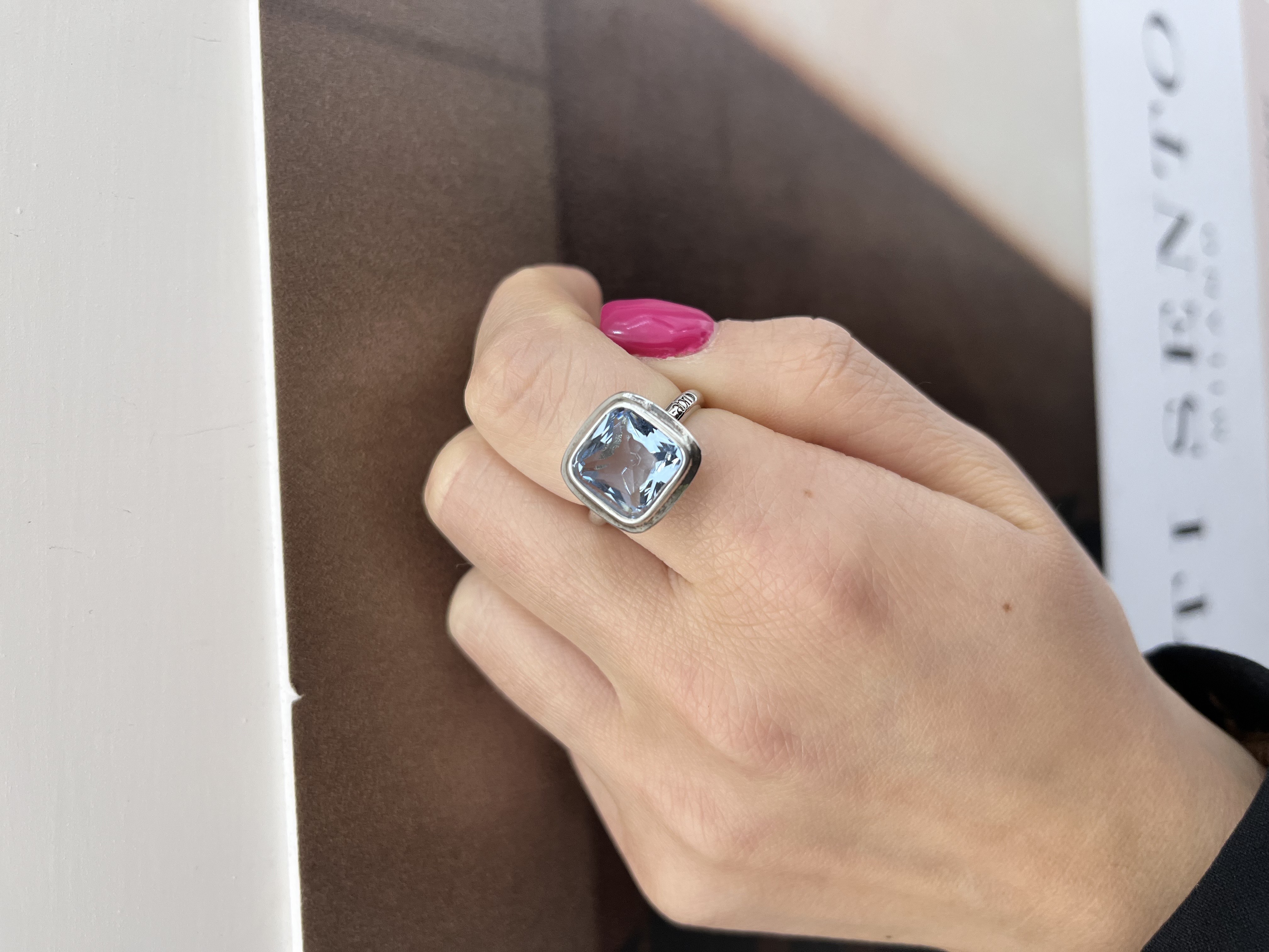 Anello in argento 925 con quarzo di colore azzurro acquamarina. I lati della montatura della pietra sono di 1,2cm circa. Misura disponibile 15. Dato che il gambo sotto é aperto, l’anello risulta leggermente regolabile. Consegna entro 3gg lavorativi. Spedizione gratuita.