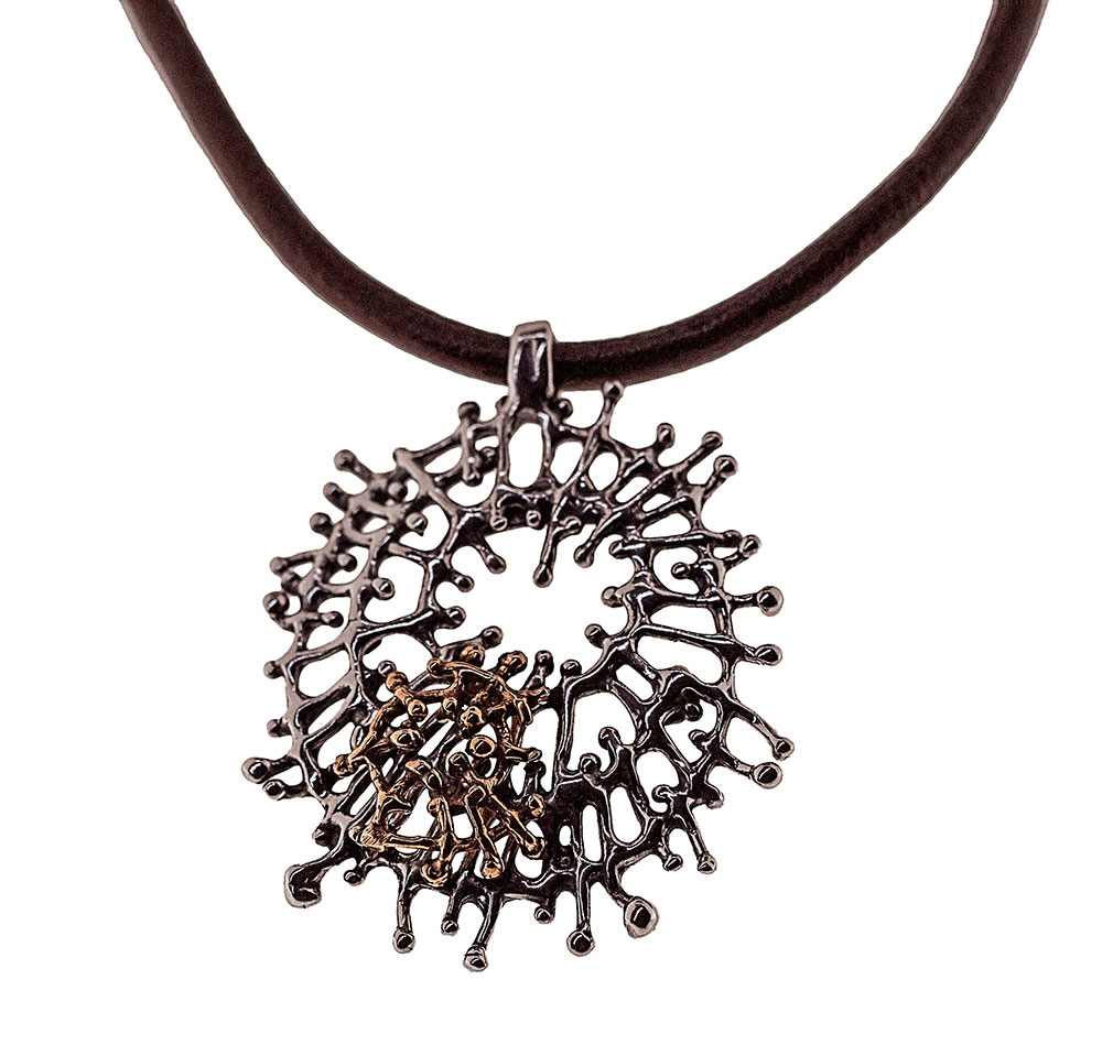 Collana in cuoio 45cm con chiusura artigianale T-Bar in argento e bronzo con pendente a forma di ragnatela in argento e bronzo. Lunghezza pendente circa cm.5. Lavorazione artigianale.Consegna entro 10 giorni lavorativi. Spedizione gratuita.