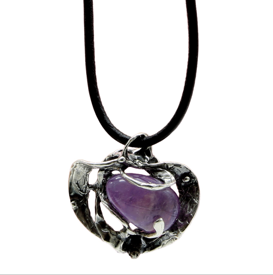 Collana sofisticata raffigurante un cuore stilizzato in argento 925 e bronzo con ametista,ma ordinabile anche con perla barocca.Laccio in cuoio nero,con chiusura T-Bar in argento e bronzo,45cm. Nella versione con ametista consegna entro 10 gg.Spedizione gratuita.