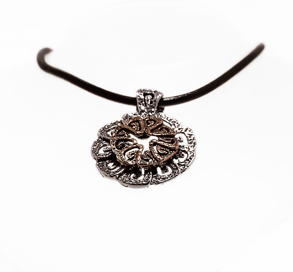 Collana in cuoio 45cm con terminali in argento e bronzo con Pendente a forma di rosone in argento 925mill. e bronzo del diametro di cm 4,3 e di lunghezza comprensiva di gancio pari a cm5,5. Produzione artigianale. Consegna entro 10 giorni lavorativi.Spedizione gratuita.